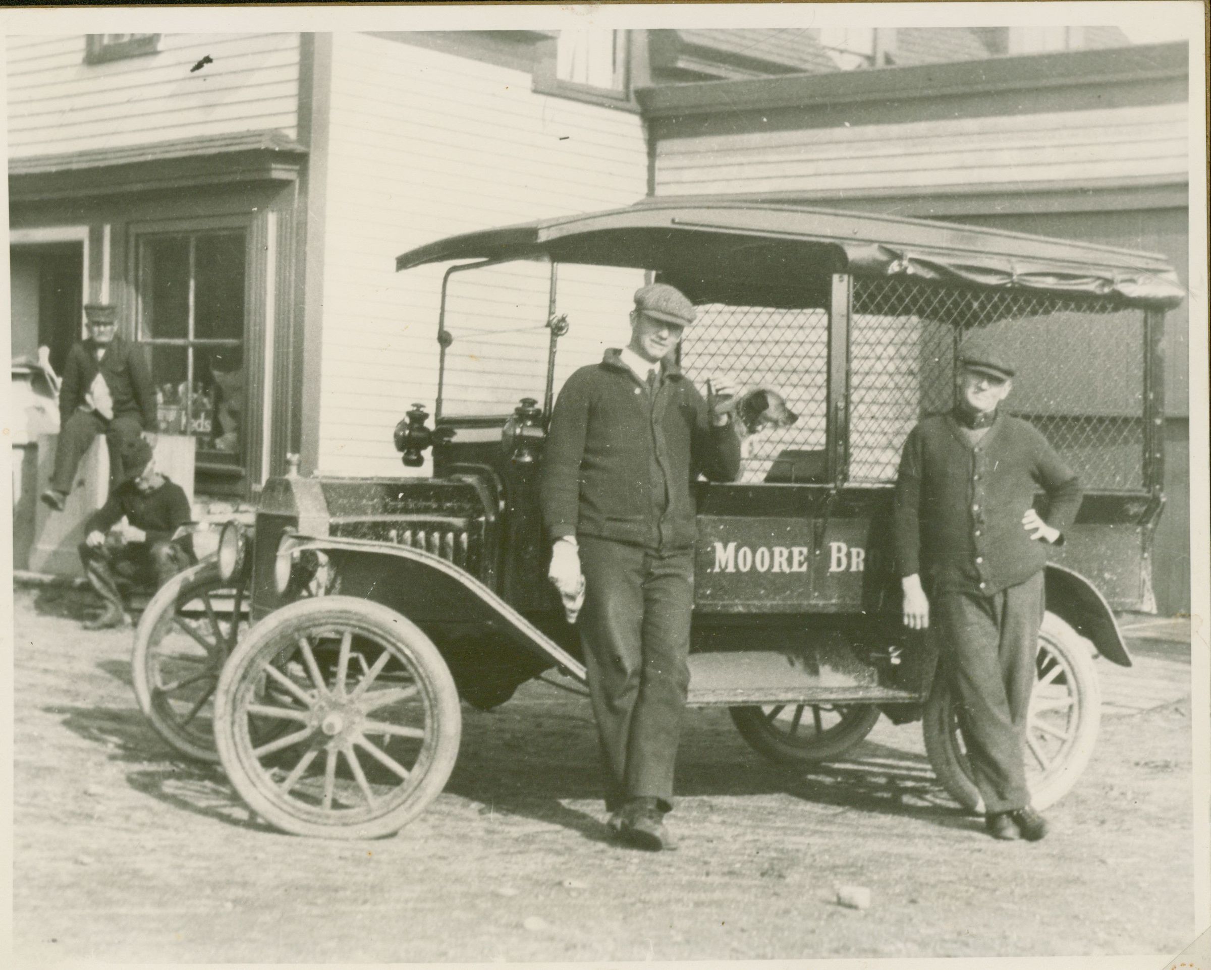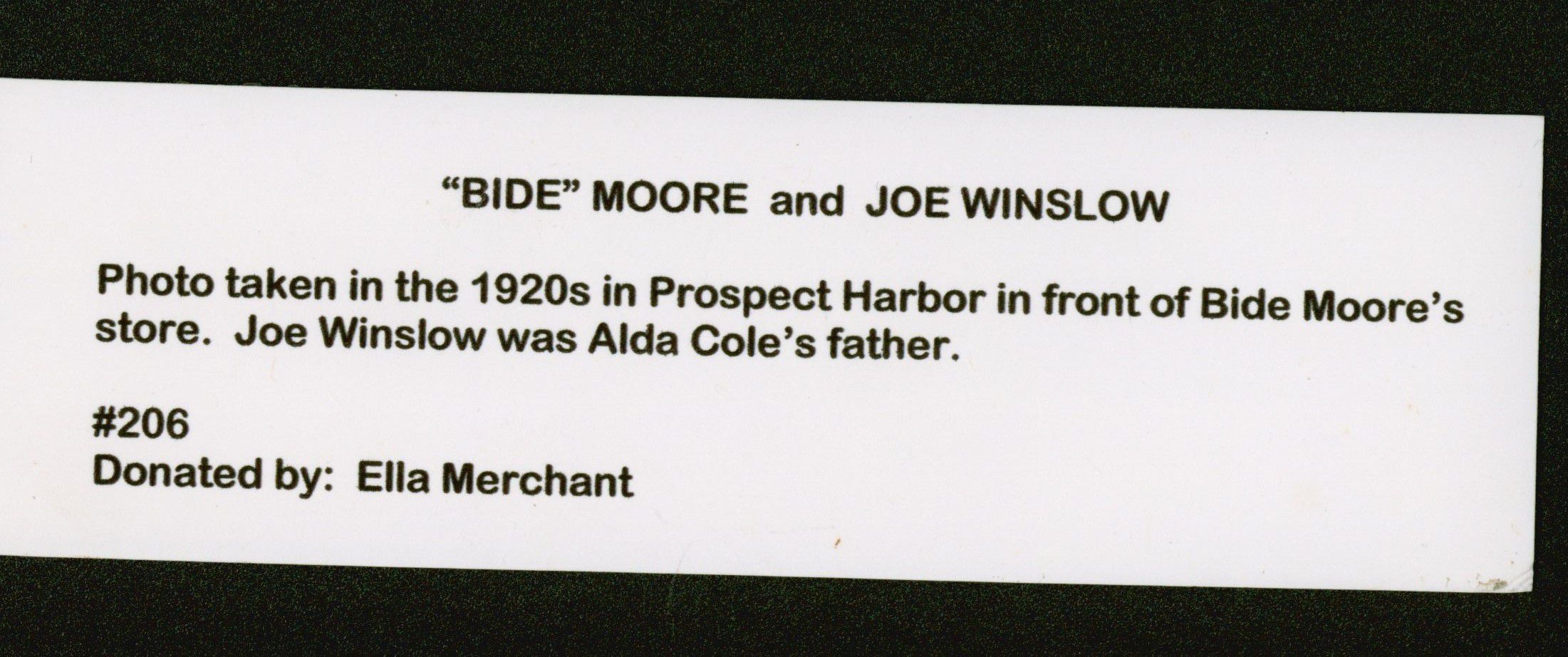 Byron Moore and Joe Winslow in front of in Byron Moore's store in Prospect Harbor, Maine circa 1920.Photograph Details