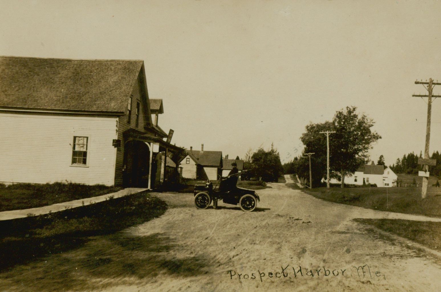 Main Street, Prospect Harbor, ME. Cole's Store in the foreground and an automobile in the street.Photograph Details