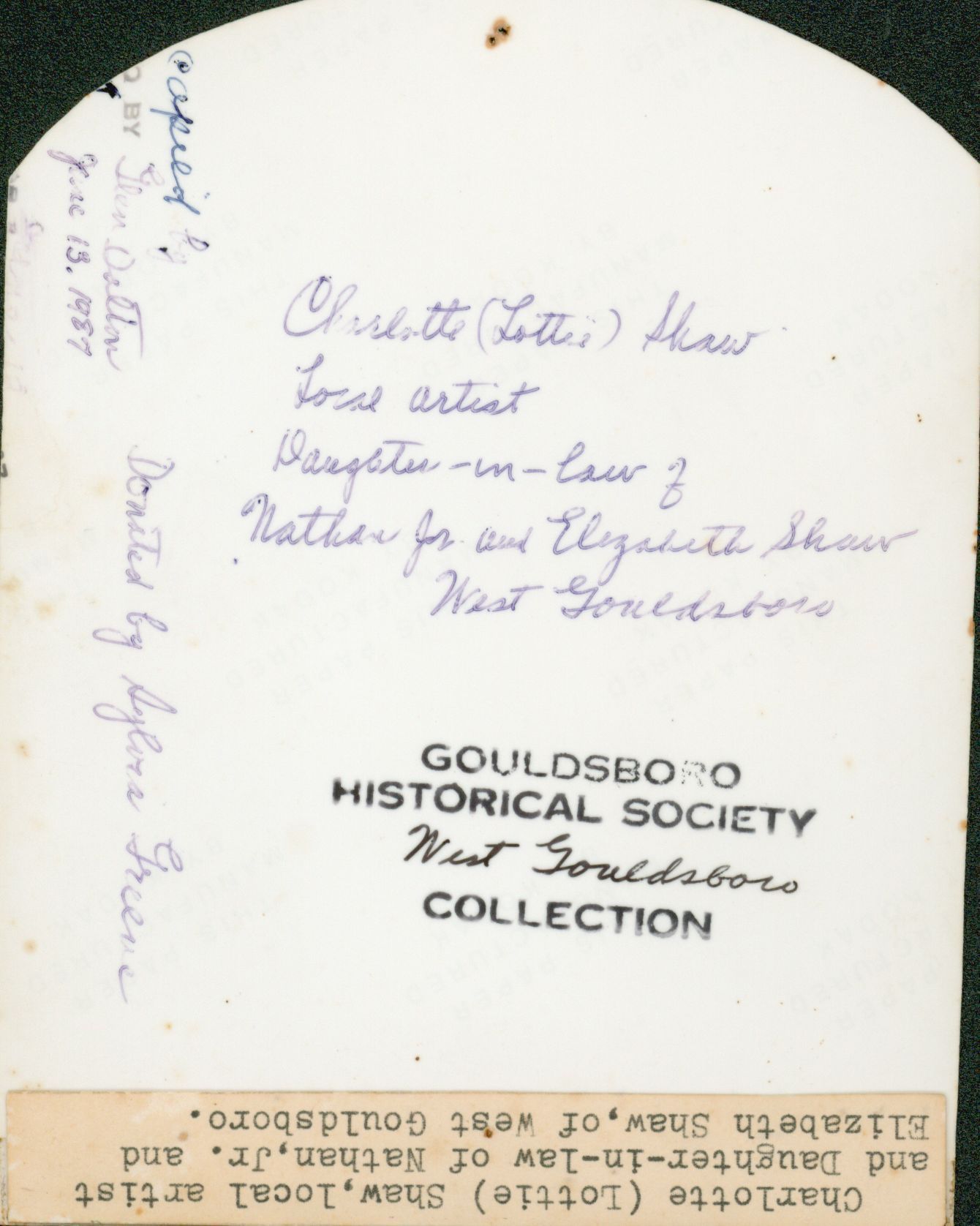 Portrait of Charlotte Cole Shaw, local artist. Wife of George L. Shaw. Daughter-in-law of Nathan Shaw, Jr and Elizabeth Haskell Shaw.Photograph Details
