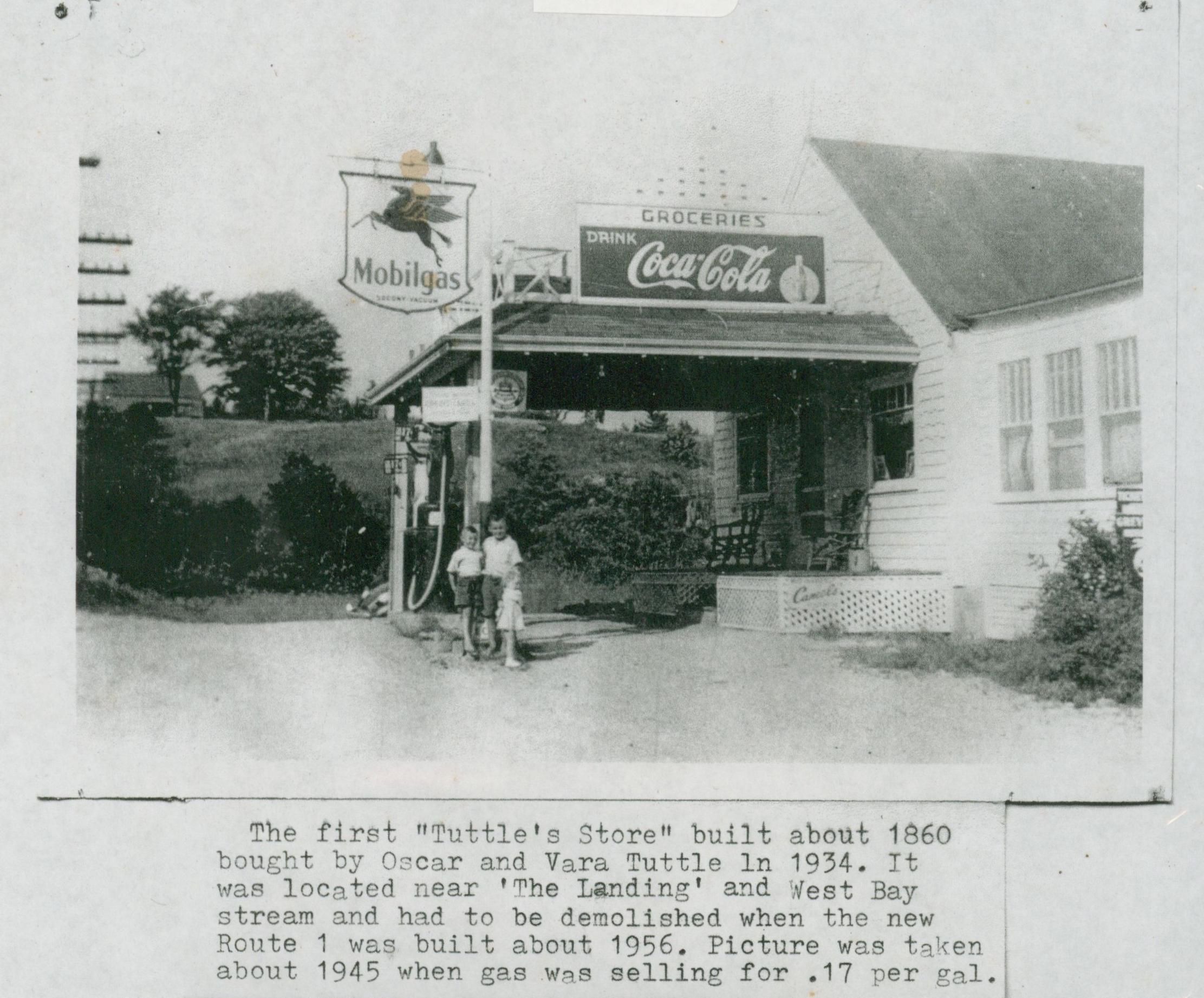 The first Tuttle's Store store was built around 1860 and bought by Oscar and Vera Tuttle in 1934. It was located near "The Landing" and the West Bay Stream. It was demolished when the new Route 1 was built around 1956. The photo was taken around 1945 when gas was 17 cents per gallon.Photograph Details