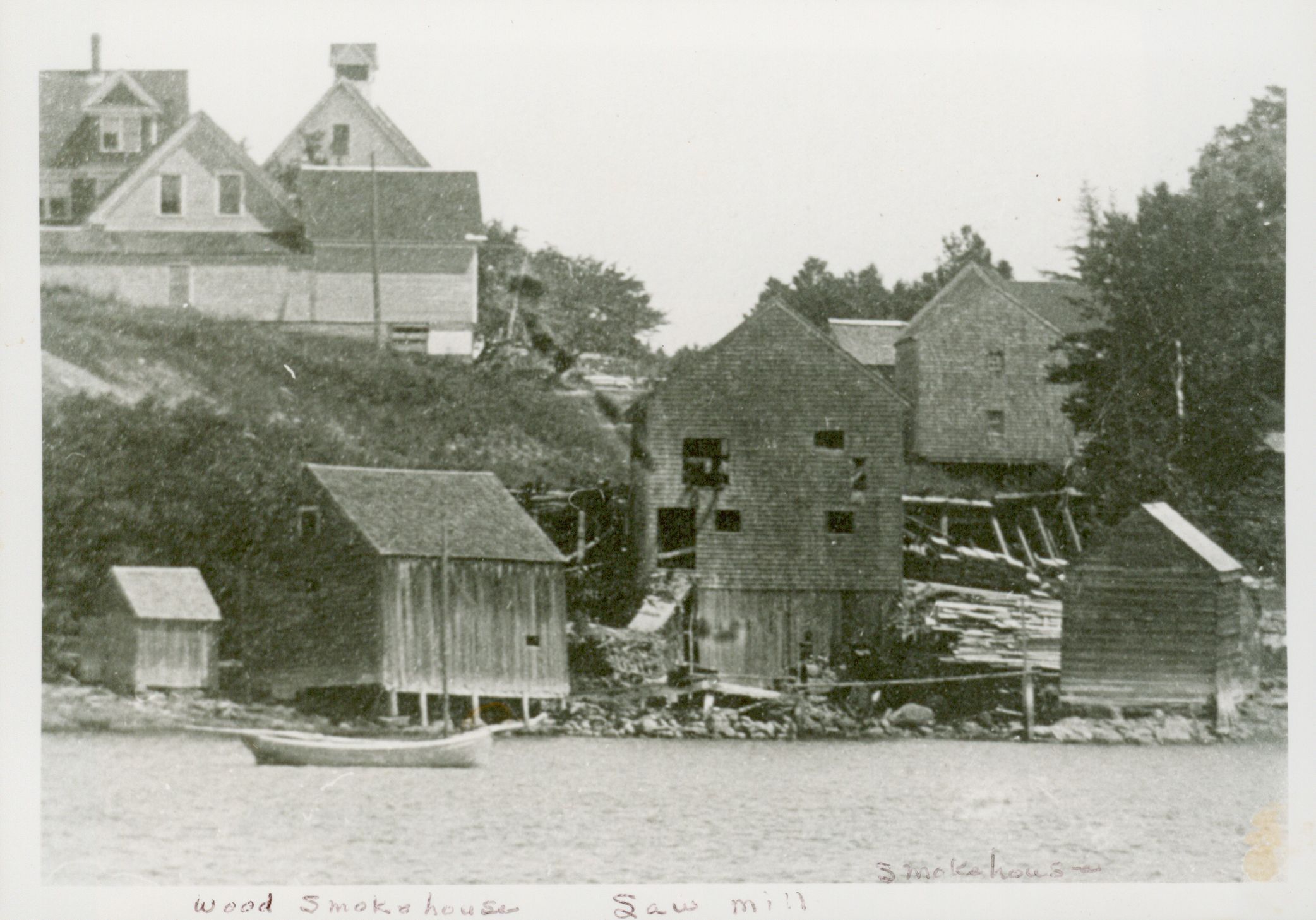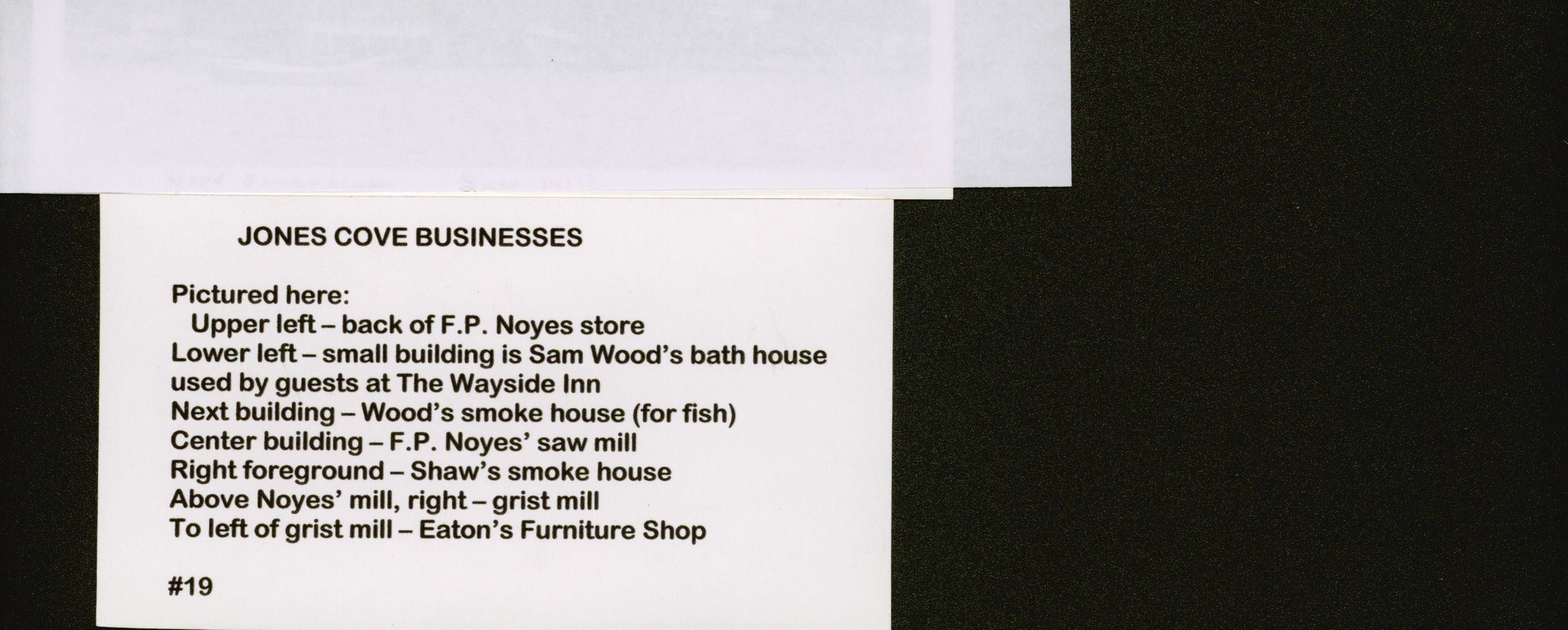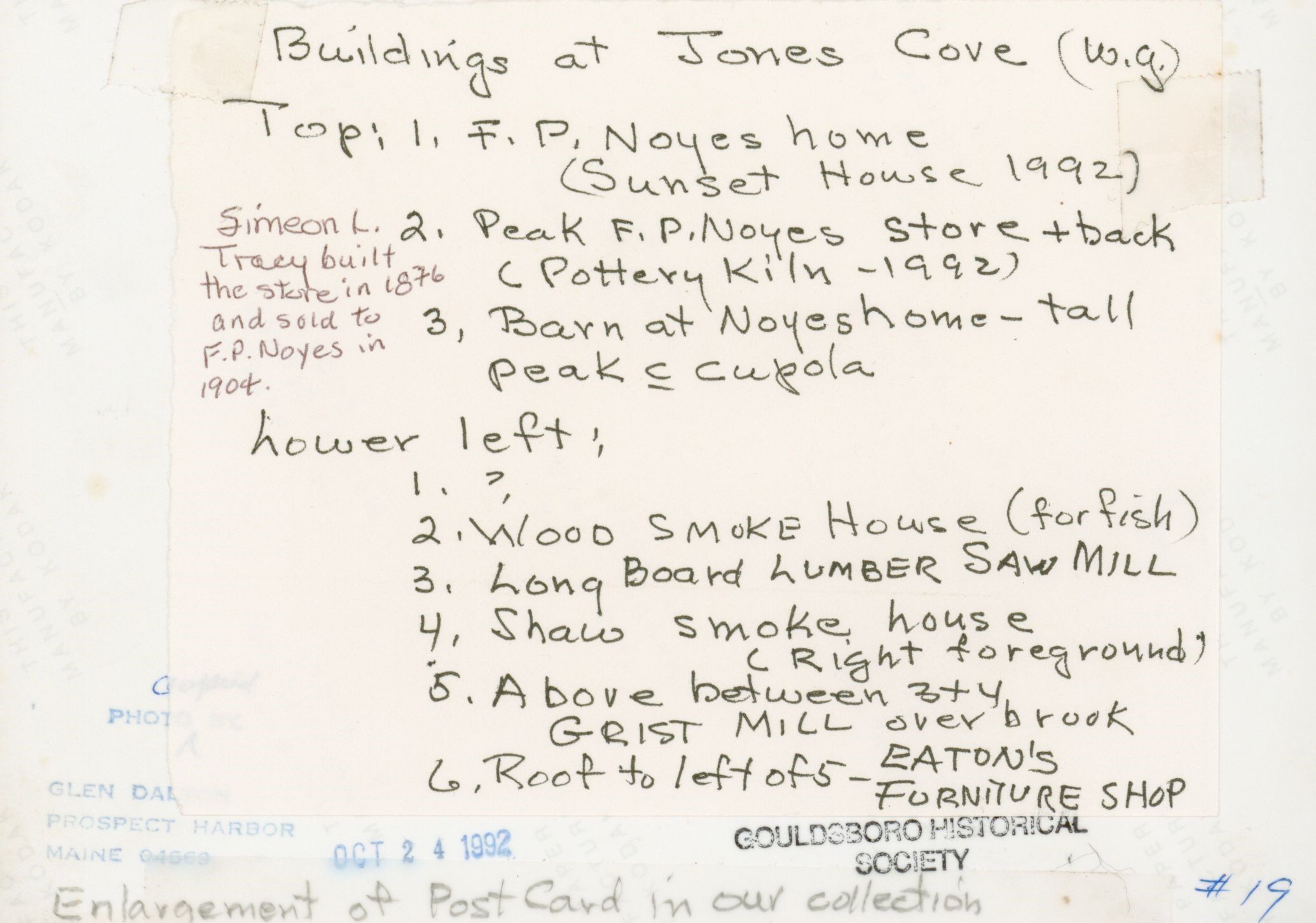 View of shore along Jones Cove in West Gouldsboro. Multiple images attached including a black-and-white enlargement with a detailed description of the buildings on the back.Photograph Details
