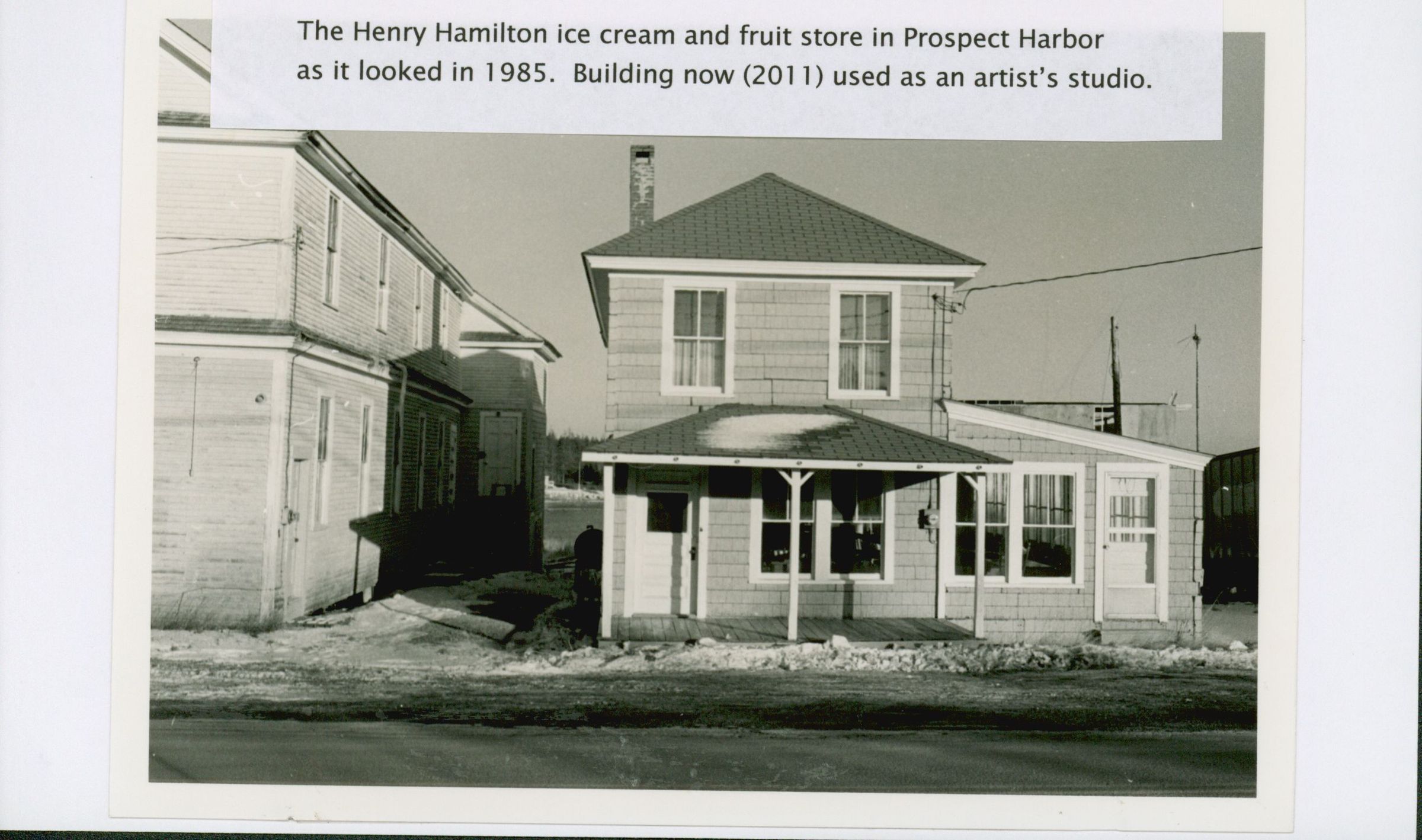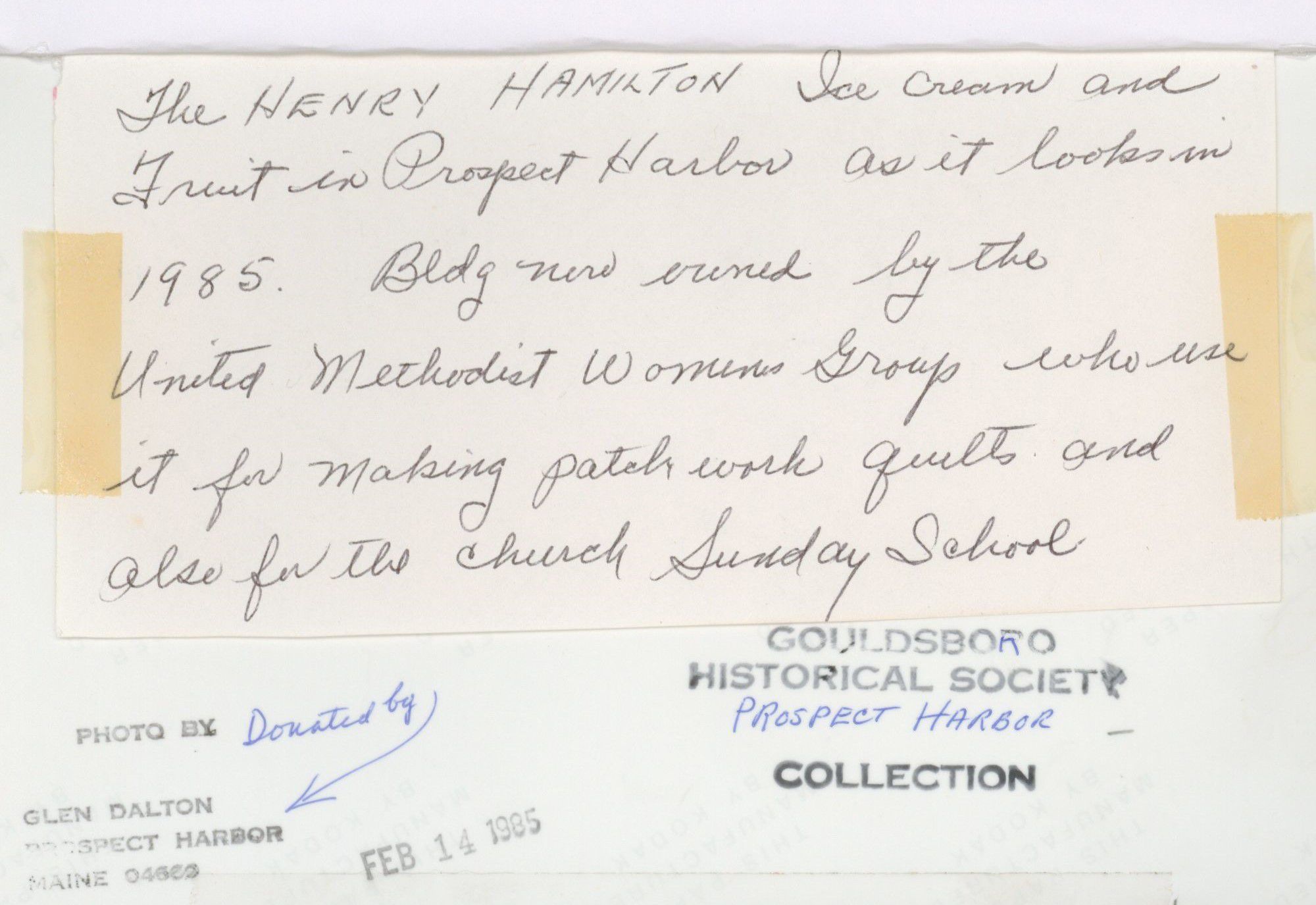 Henry Hamilton Ice Cream and Fruit Store located in Prospect Harbor, Maine. In 1985, the building was owned by the United Methodist Women's Group who used it for a space to make quilts and for the Church Sunday School.Photograph Details