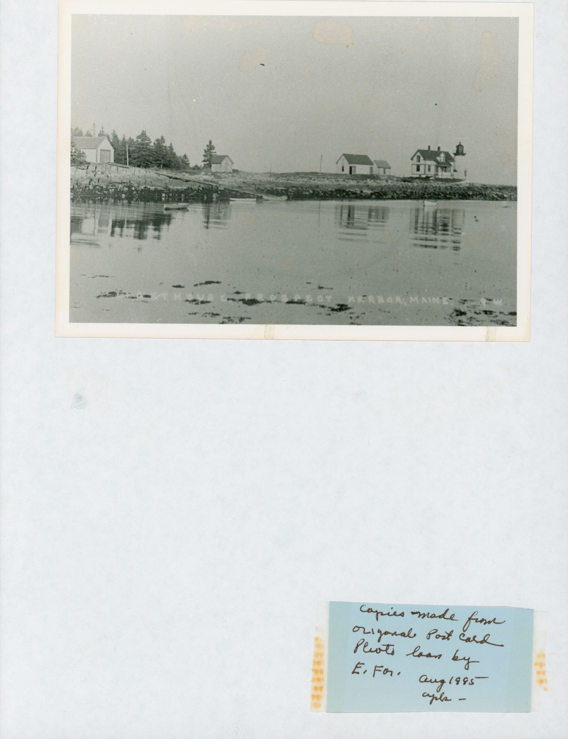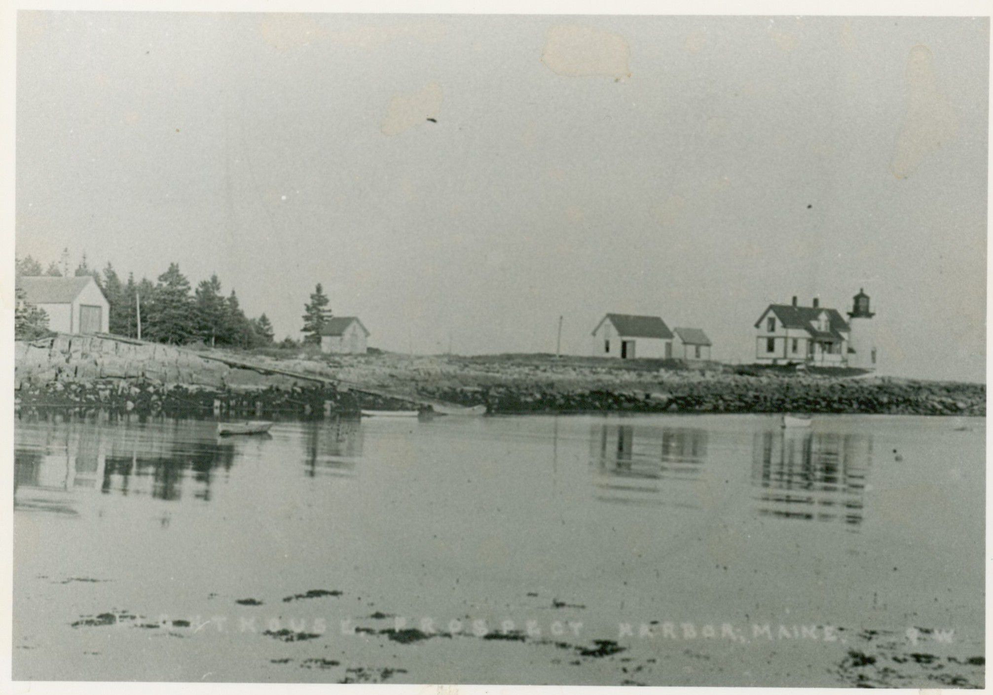 Postcard of the Prospect Harbor Lighthouse, Keeper's Cottage, Oil House, and other outbuildings along the rocky shore.Photograph Details