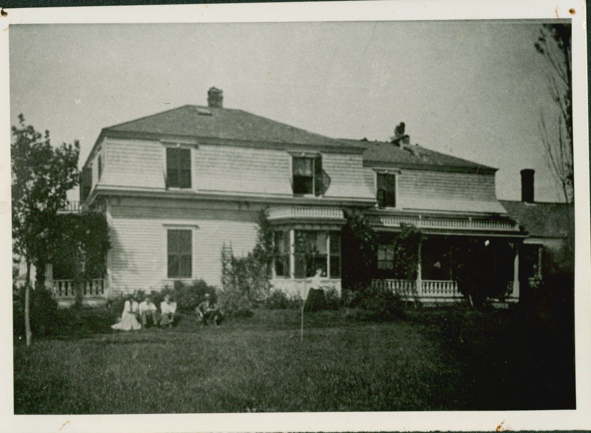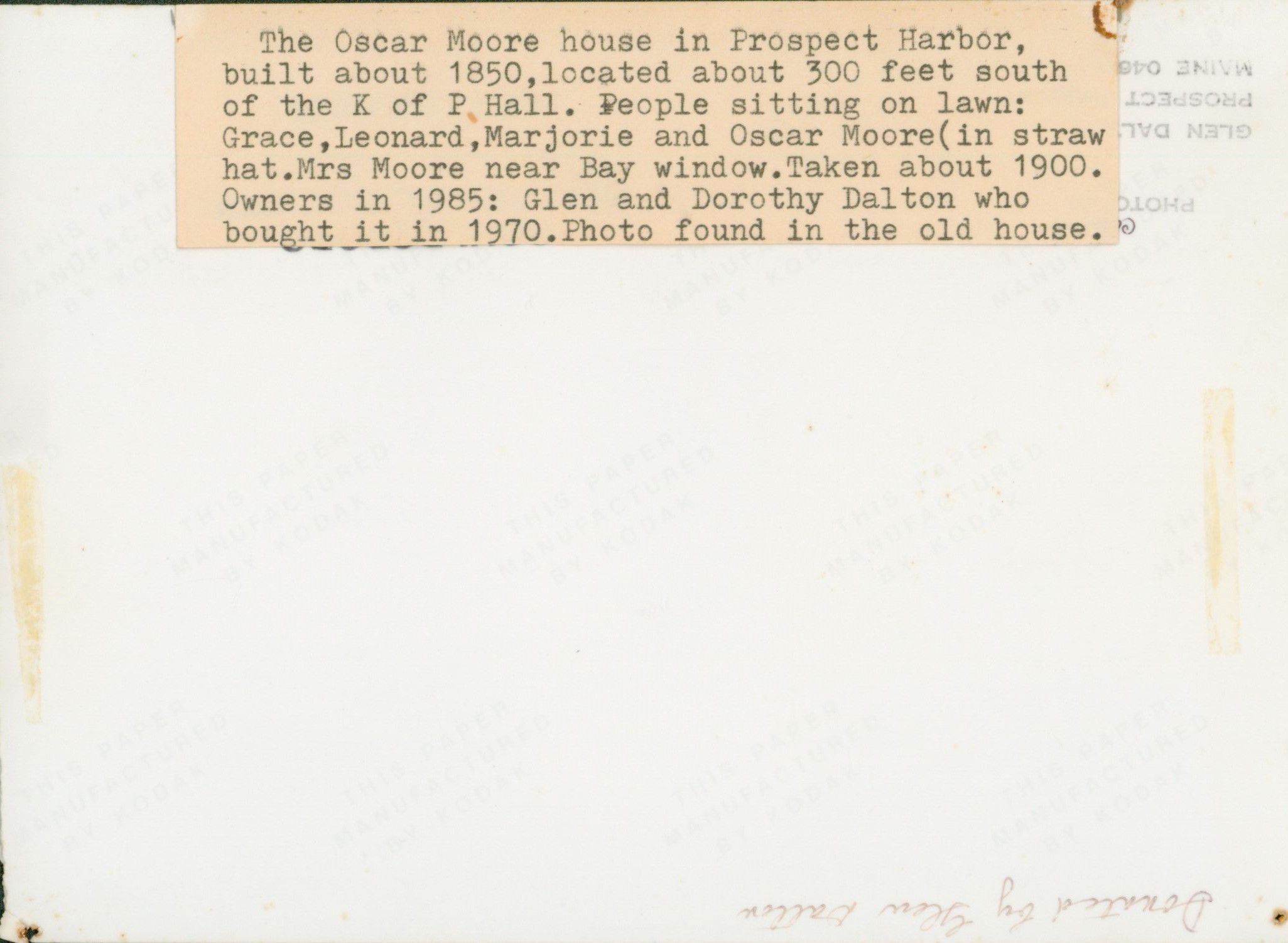 Oscar Moore house in Prospect Harbor built around 1850 about 300 feet south of the Knights of Pythias Hall on Main Street. Moore family members sitting on the lawn from left to right: Grace, Leonard, Marjorie, and Oscar. Photo taken circa 1900. Photo discovered in the house by Glen and Dorothy Dalton in 1975.Photograph Details