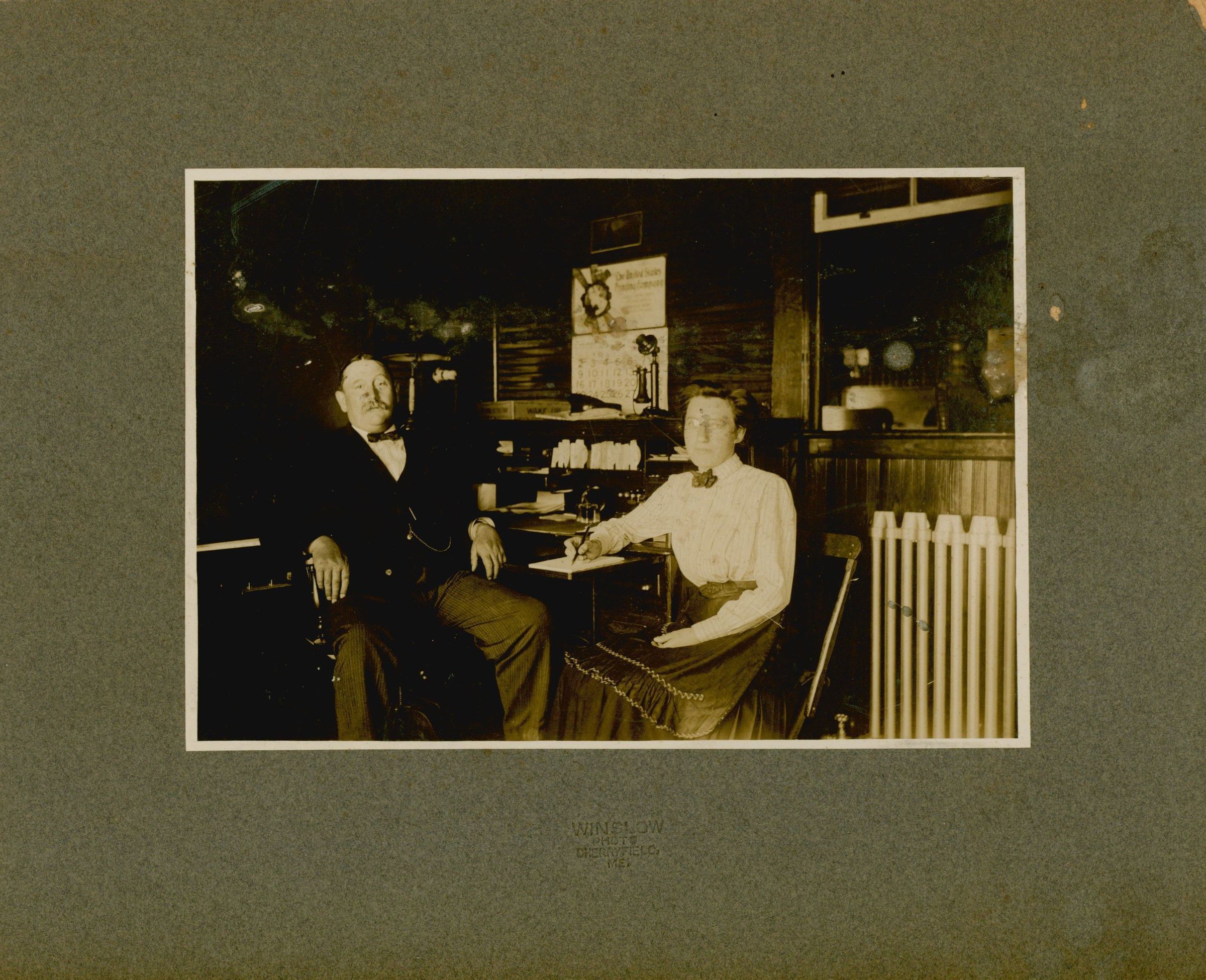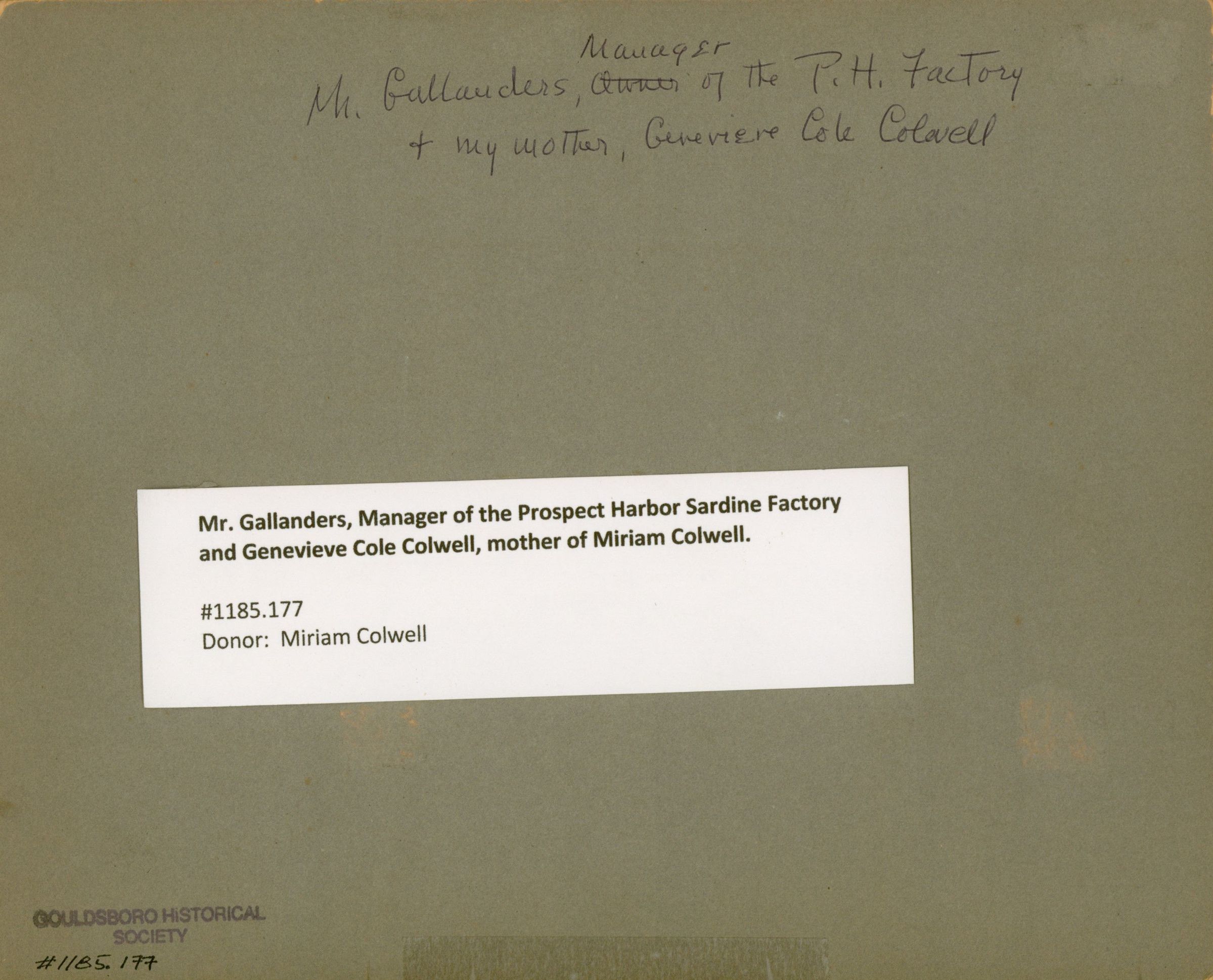 Mr. Gallanders, manager of the E. T. Russell Sardine Factory, Prospect Harbor, Maine with Genevieve Cole Colwell.Entry/Object ID