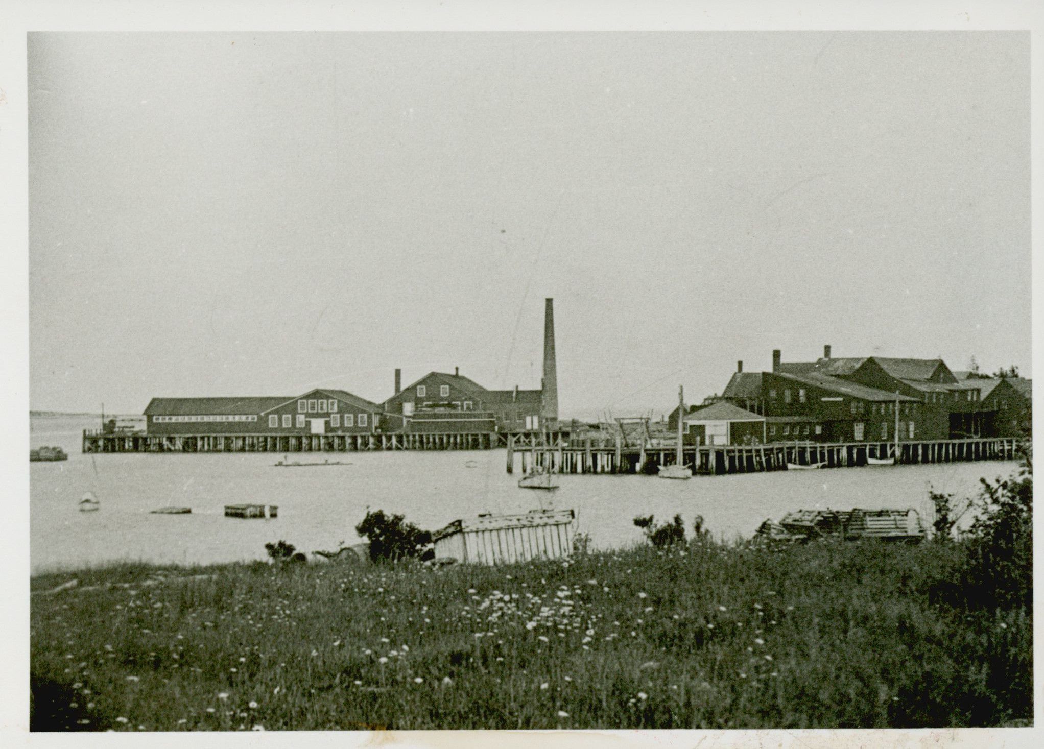 Stinson Canning Company in Prospect Harbor, Maine as it looked before it was destroyed by fire on May 9, 1968. This building was replaced with another on the same site. Grassy shore in the foreground.Photograph Details