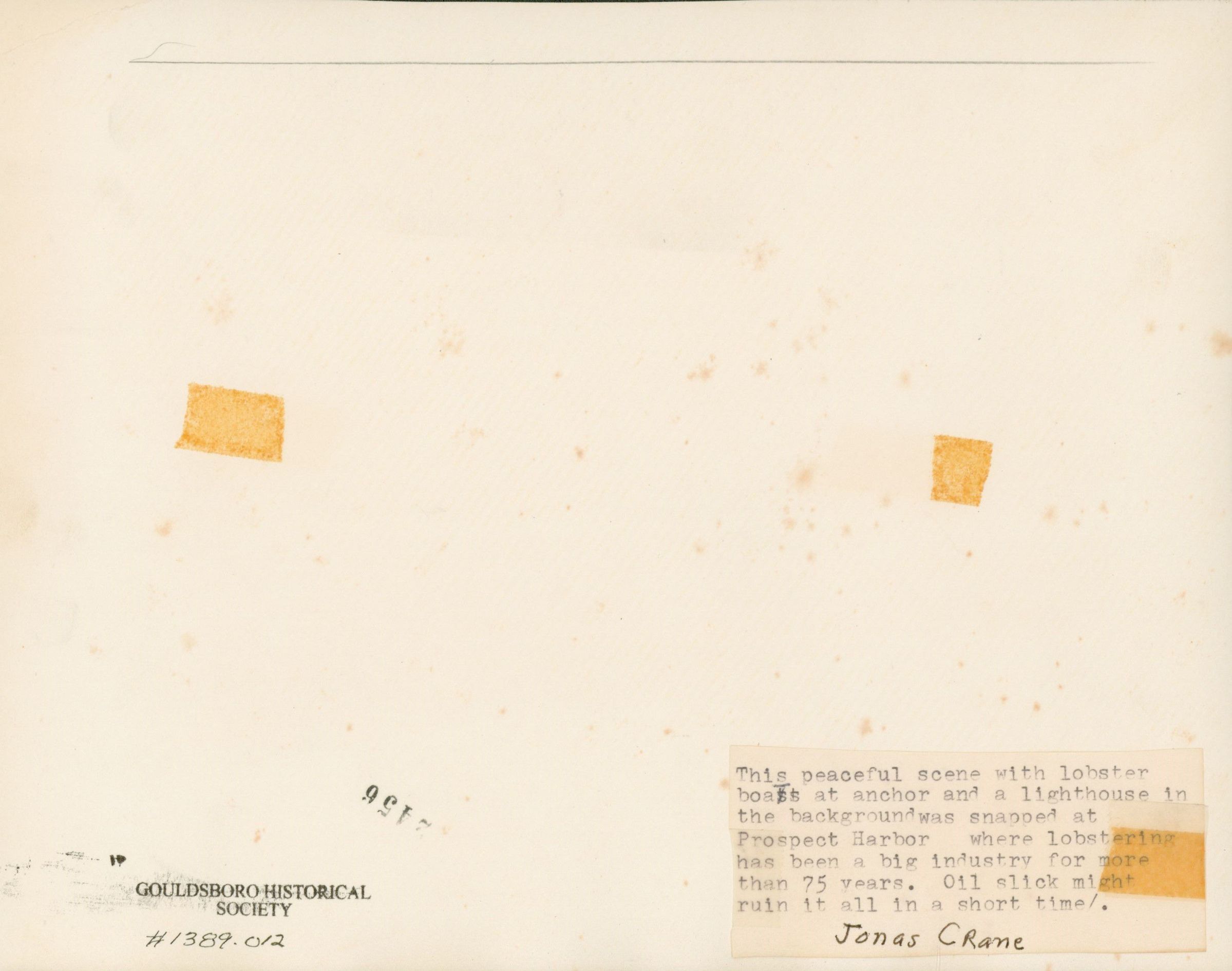 Lobster boats in the harbor as viewed from the shore. Prospect Harbor, ME. Lighthouse in the background.Photograph Details