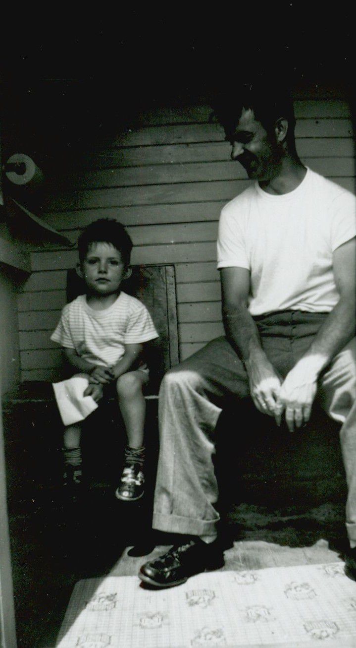 John and Gordon Workman, Sr. inside the Outhouse at the Prospect Harbor Lighthouse.Photograph Details