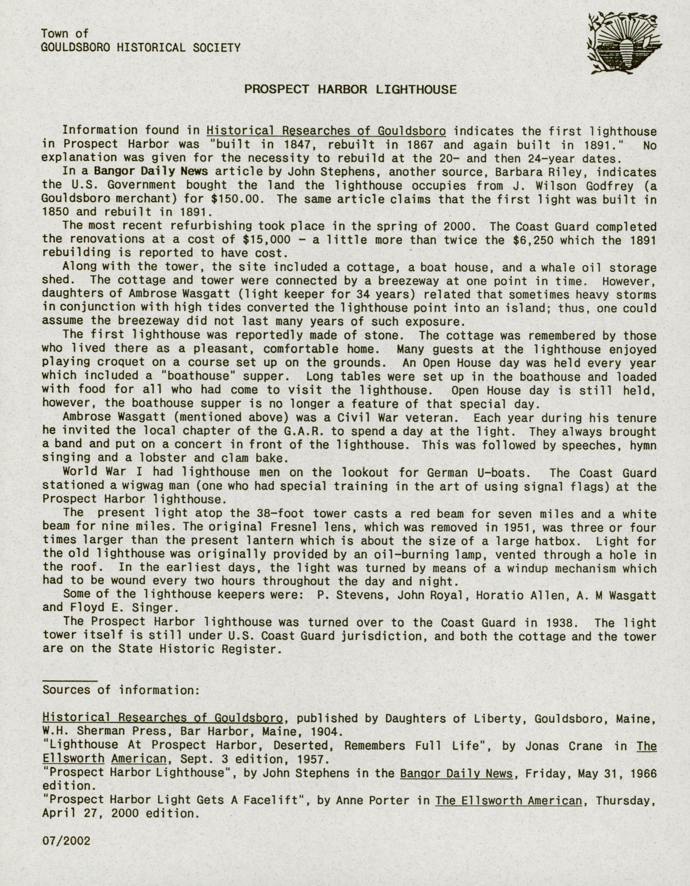 Brief history of the Prospect Harbor Lighthouse.Archive Details