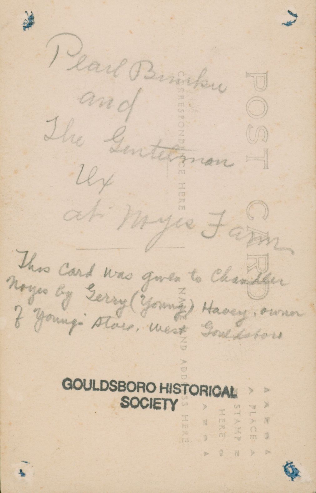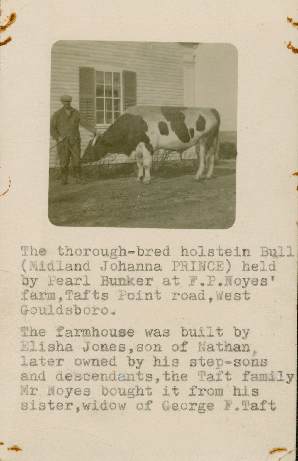 Pearl Bunker holding an ox at the Frank P. Noyes Farm on Taft Point Road. The farmhouse was built by Elisha Jones, son of Nathan Jones, later owned by his descendants - the Taft family. Noyes bought the farm from his sister, Abbie Noyes Taft, widow of George F. Taft.Photograph Details