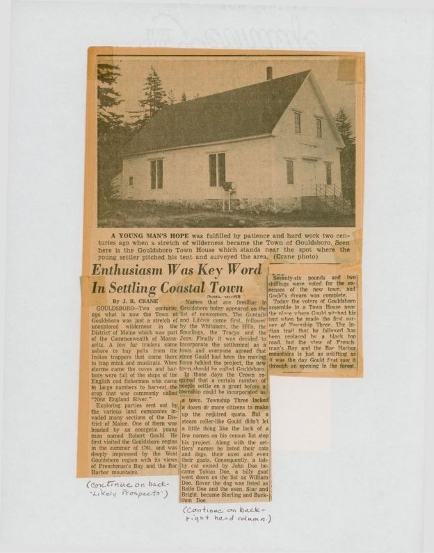 Article about origins of Gouldsboro, Maine and early settlers such as Robert Gould. Includes photo of Gouldsboro Town House on Route 1.Publication Details