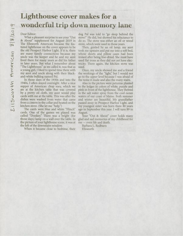 Letter to Ellsworth American Editor regarding Prospect Harbor Lighthouse memories