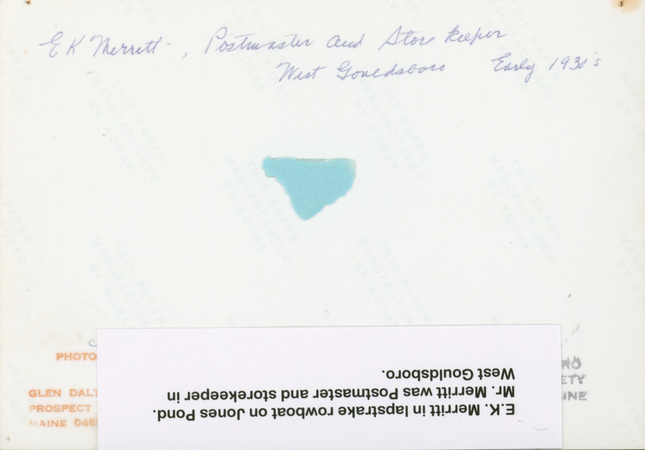 E. K. Merritt in a lapstrake rowboat on the shore of Jones Pond. Merritt was Postmaster and storekeeper in West Gouldsboro. Photo taken circa 1930.Photograph Details