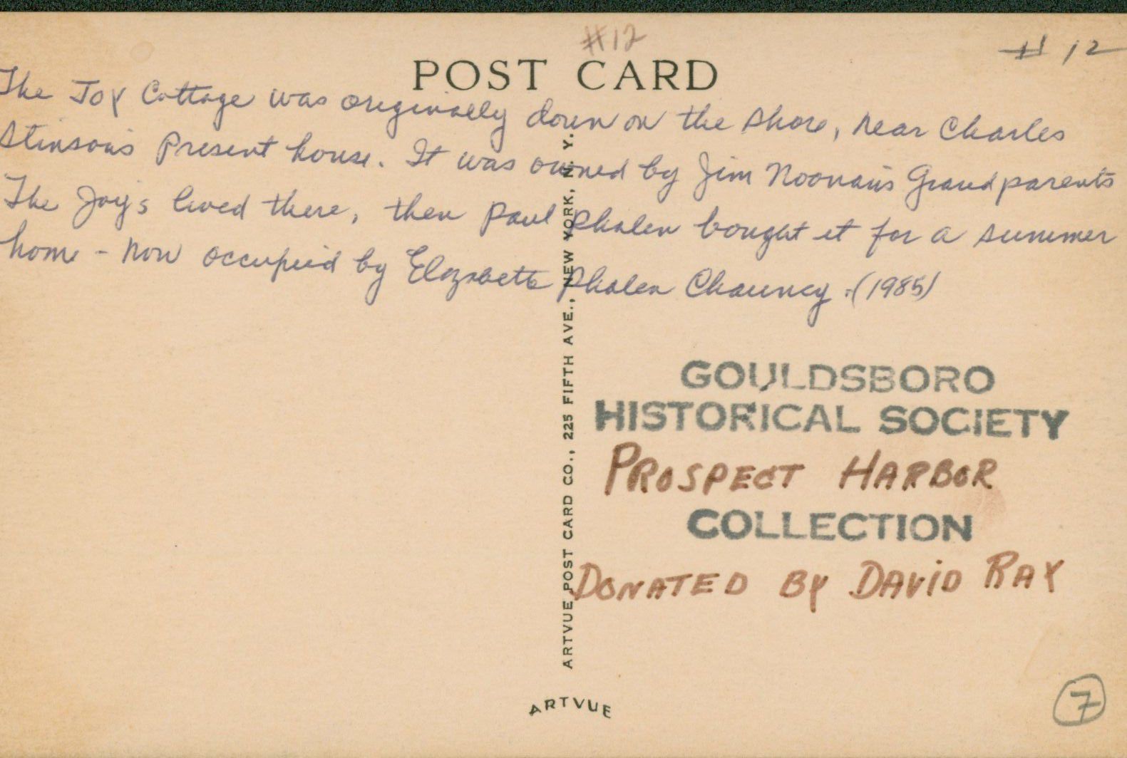The Joy Cottage was originally down on the shore near the Charles Stinson House. It was owned by Jim Noonan's grandparents. The Joys lived there then Paul Phalen bought it for a summer home. Occupied by Elizabeth Phalen Chauncy in 1985.Photograph Details