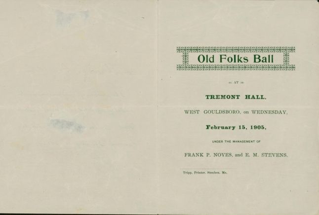 Invitation to the Old Folks Ball at the Tremont Hall in West Gouldsboro, Maine on Wednesday, February 15, 1905. Under the management of Frank. P. Noyes and E. M. Stevens. Invitation and envelope addressed to Mr. George Gouldsboro.Relationships
