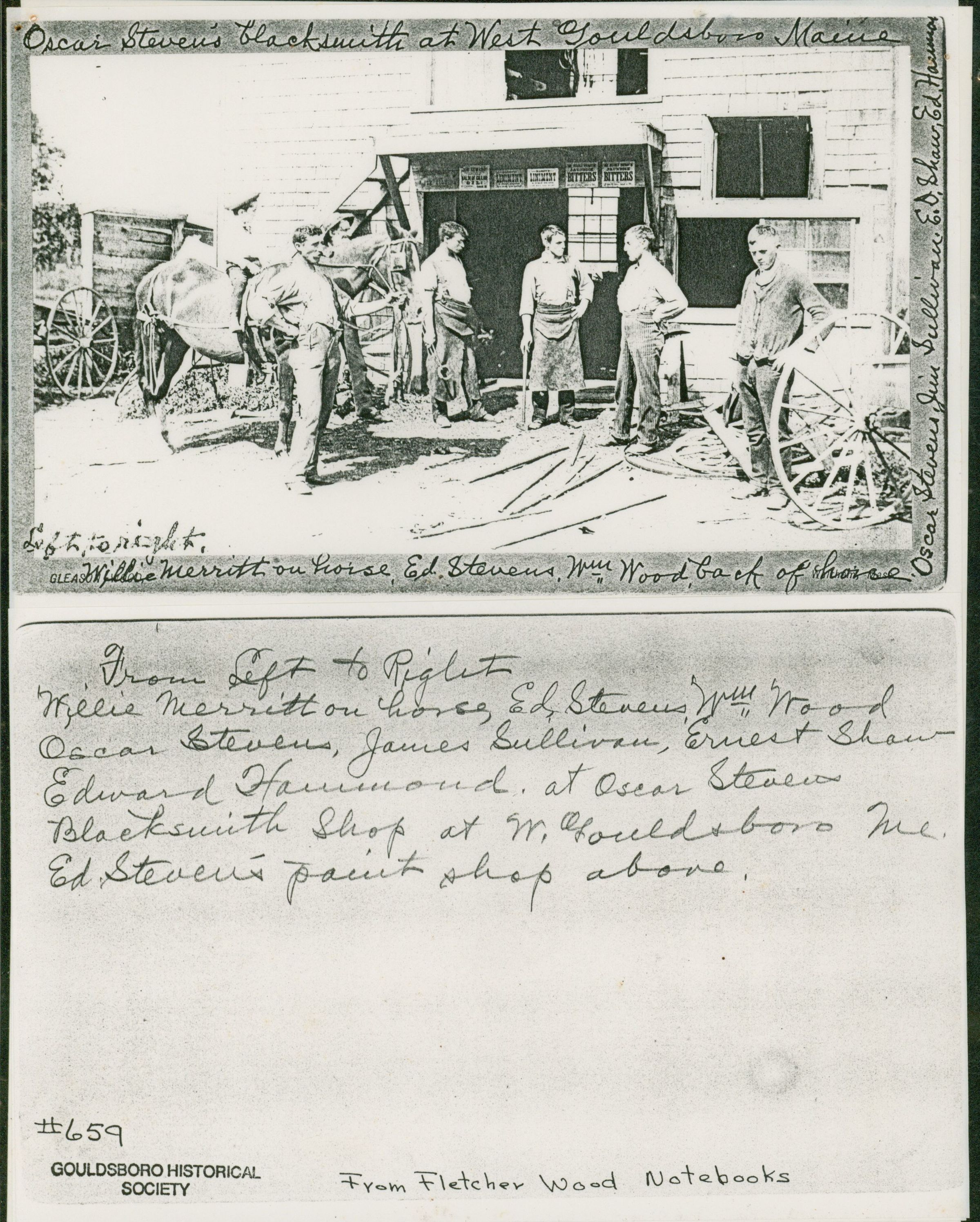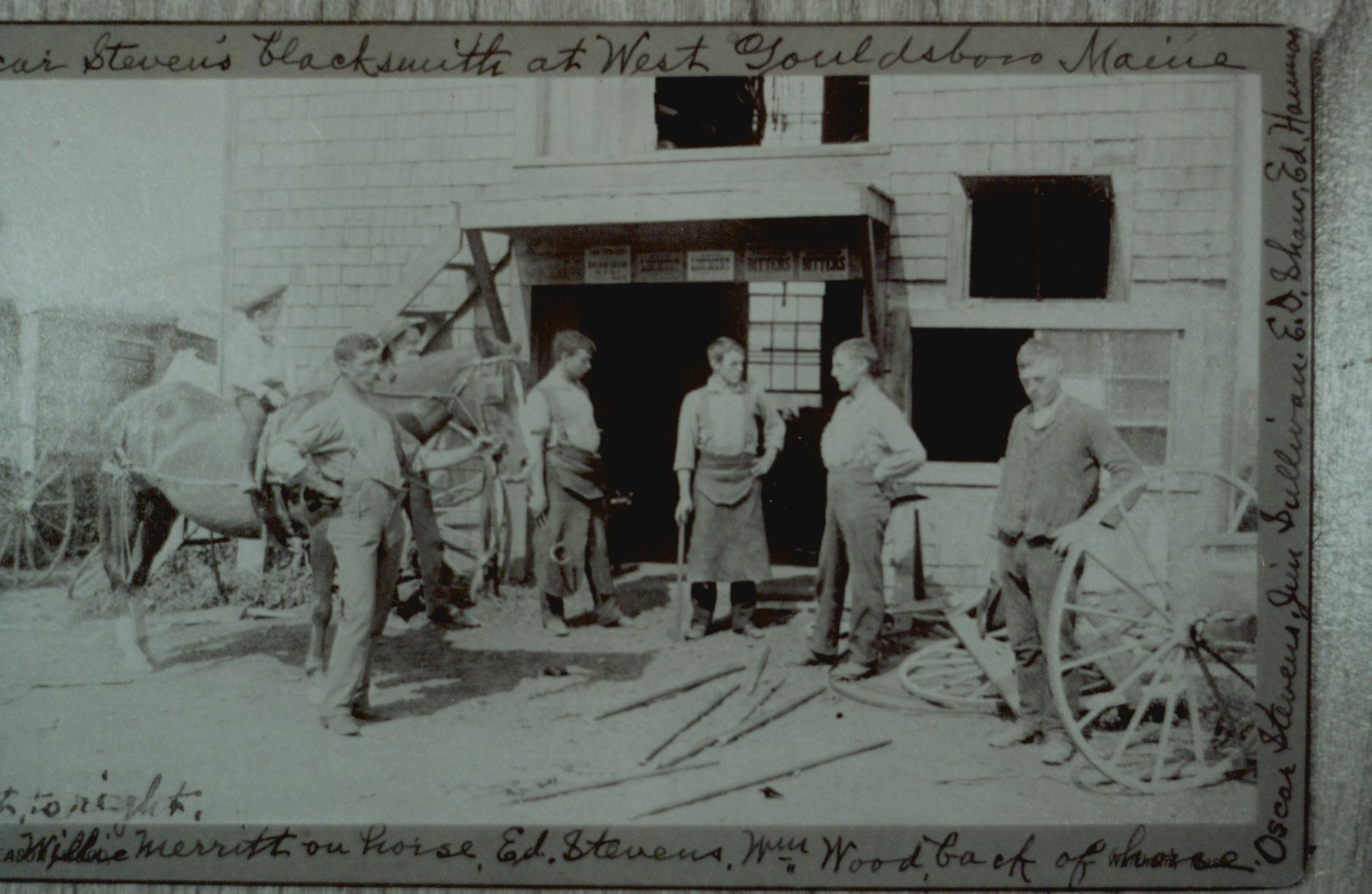 Men in front of Oscar Steven's Blacksmith Shop. Ed Steven's paint shop was located on the second floor. Pictured from L to R: Willie Merritt on the horse, Ed Stevens, William Wood, Oscar Stevens, James Sullivan, Ernest Shaw, and Edward Hammond.Photograph Details