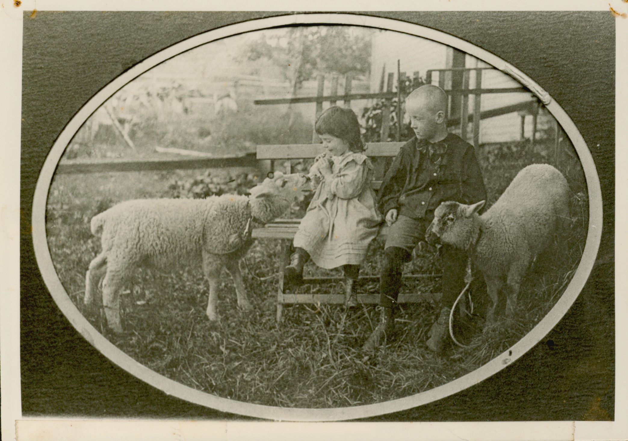Blanche and Alpheus Kingsley, children of Arthur Brown Kingsley and Emma Whitten Kingsley, with their sheep.Photograph Details