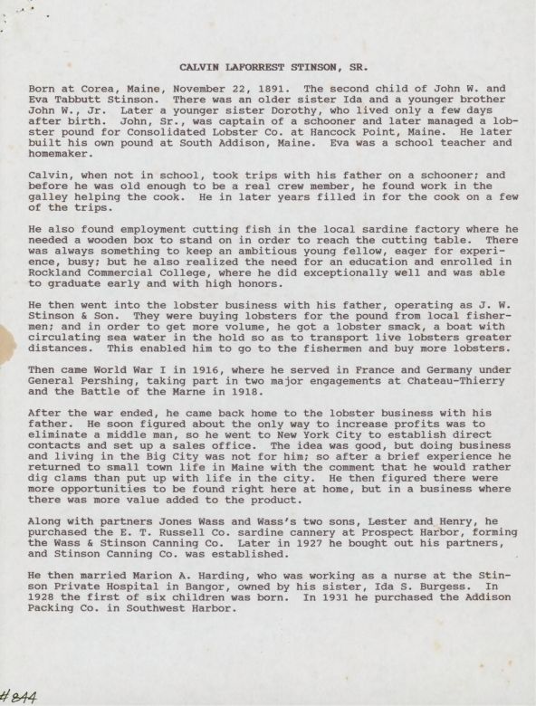 Biography of Calvin Laforrest Stinson, Sr. written by Calvin Laforrest Stinson, Jr. and signed by other descendants. It was read by Elinor Vassey at September 13, 1993 G.H.S. meeting.Update Date