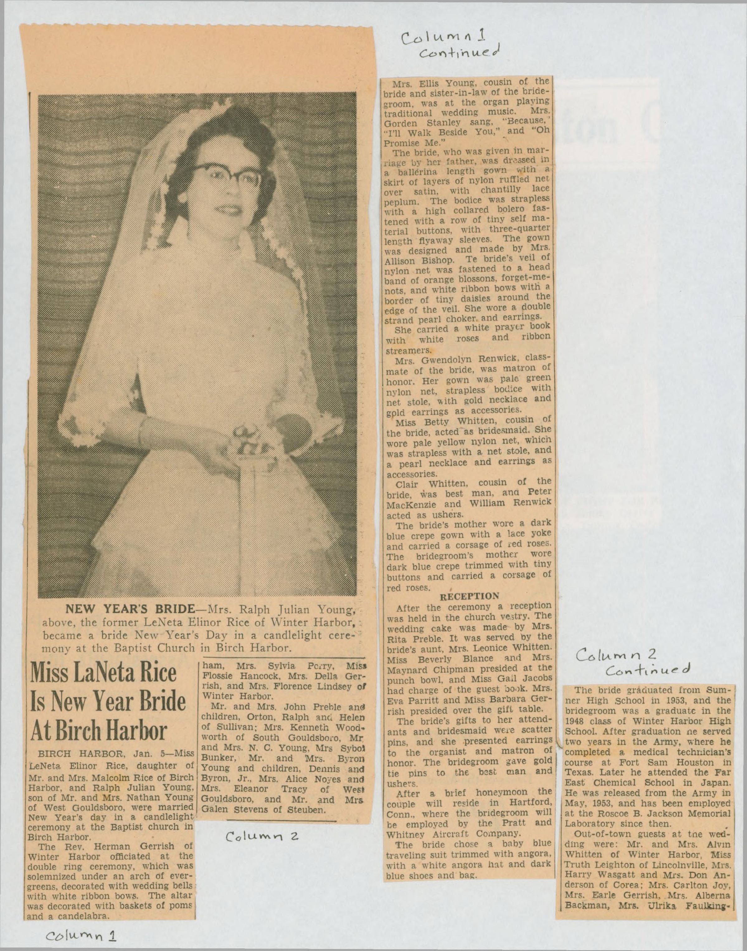 Marriage Announcement for LeNeta Elinor Rice and Ralph Julian Young. A candlelight ceremony on New Year's Day in the Birch Harbor Baptist Church.Archive Details