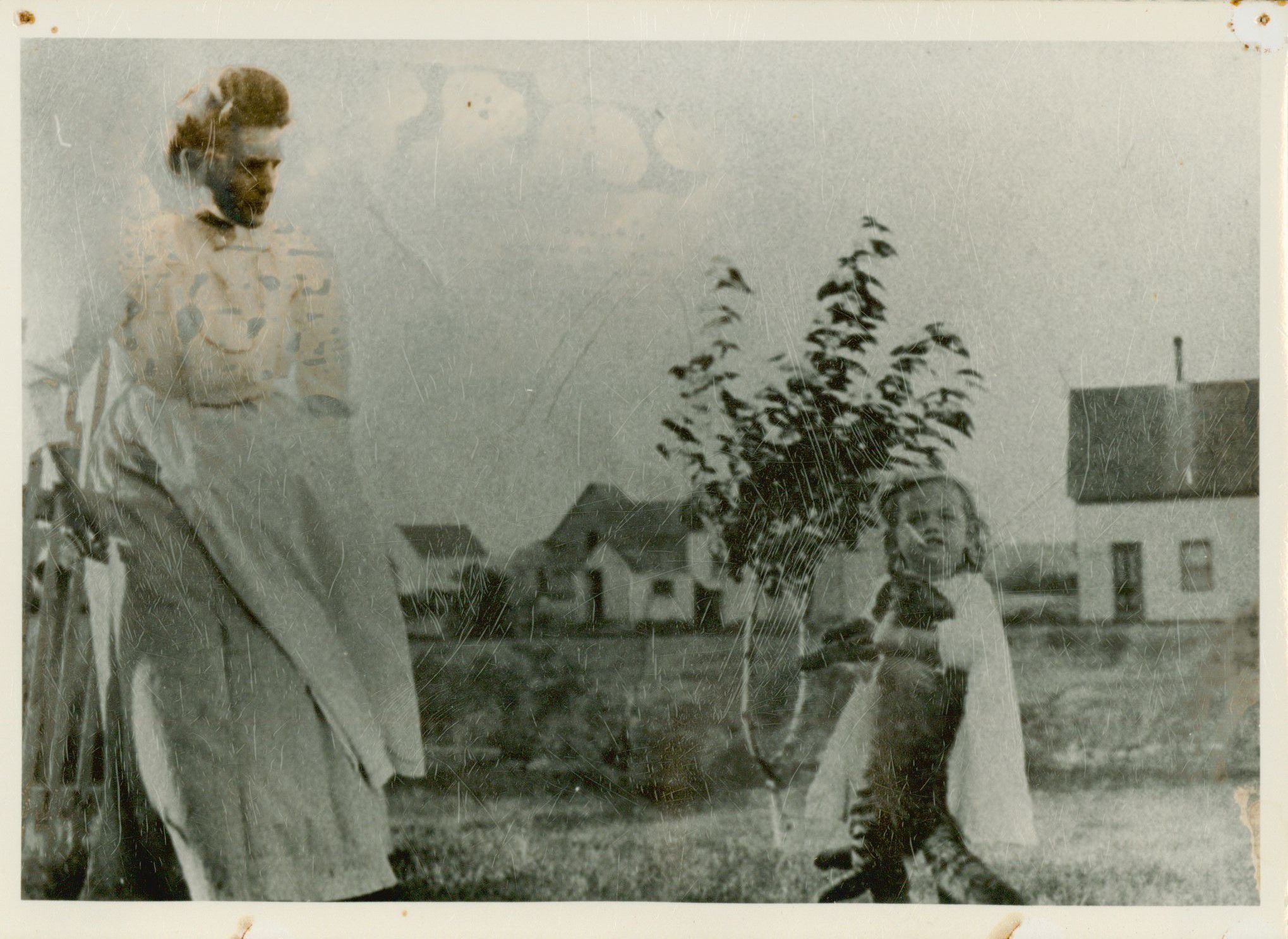 Nellie and Avis Temple playing with a cat on the homestead circa 1910. Avis is two-years-old.Photograph Details