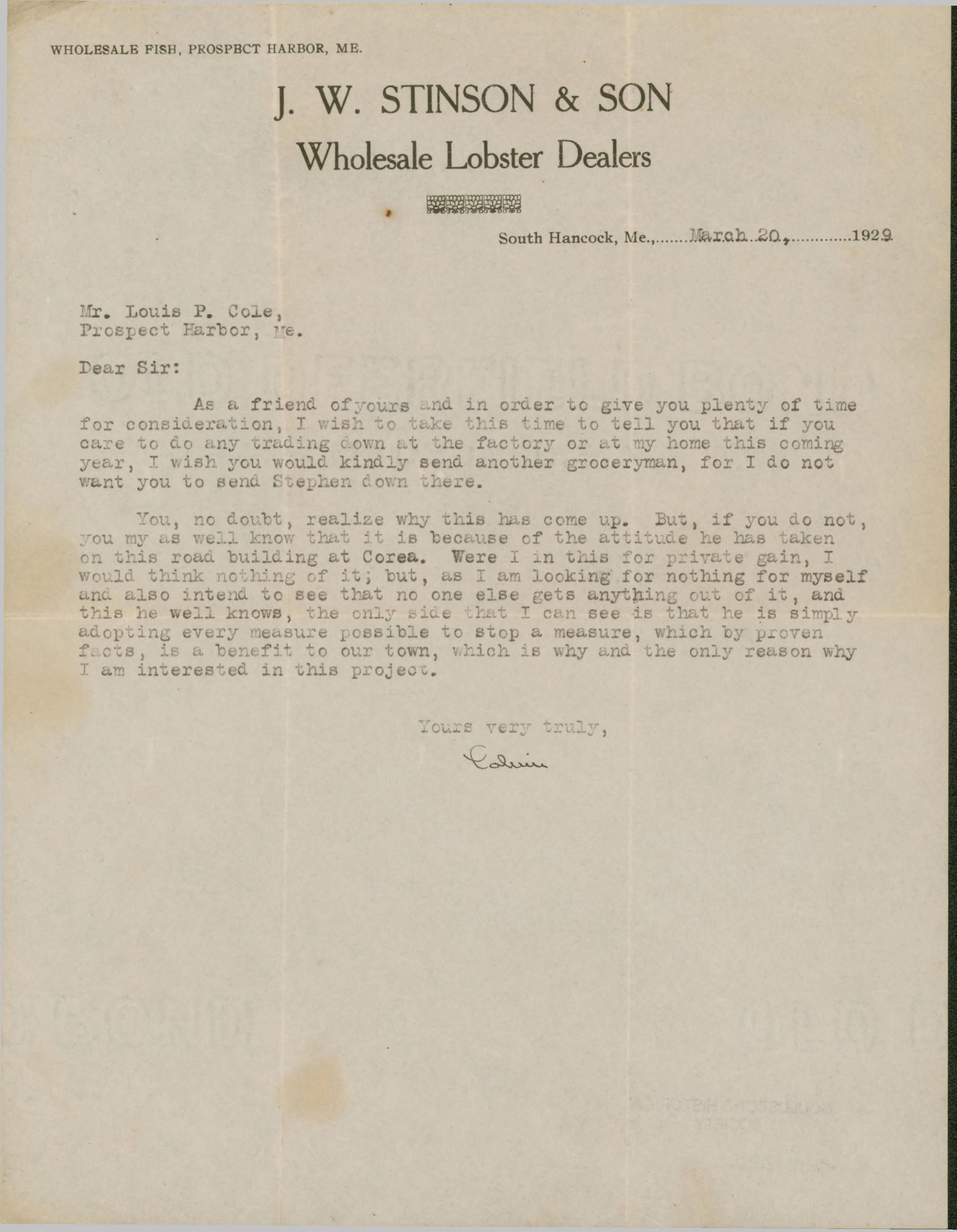 Letter from Calvin L. Stinson to Louis P. Cole.Entry/Object ID
