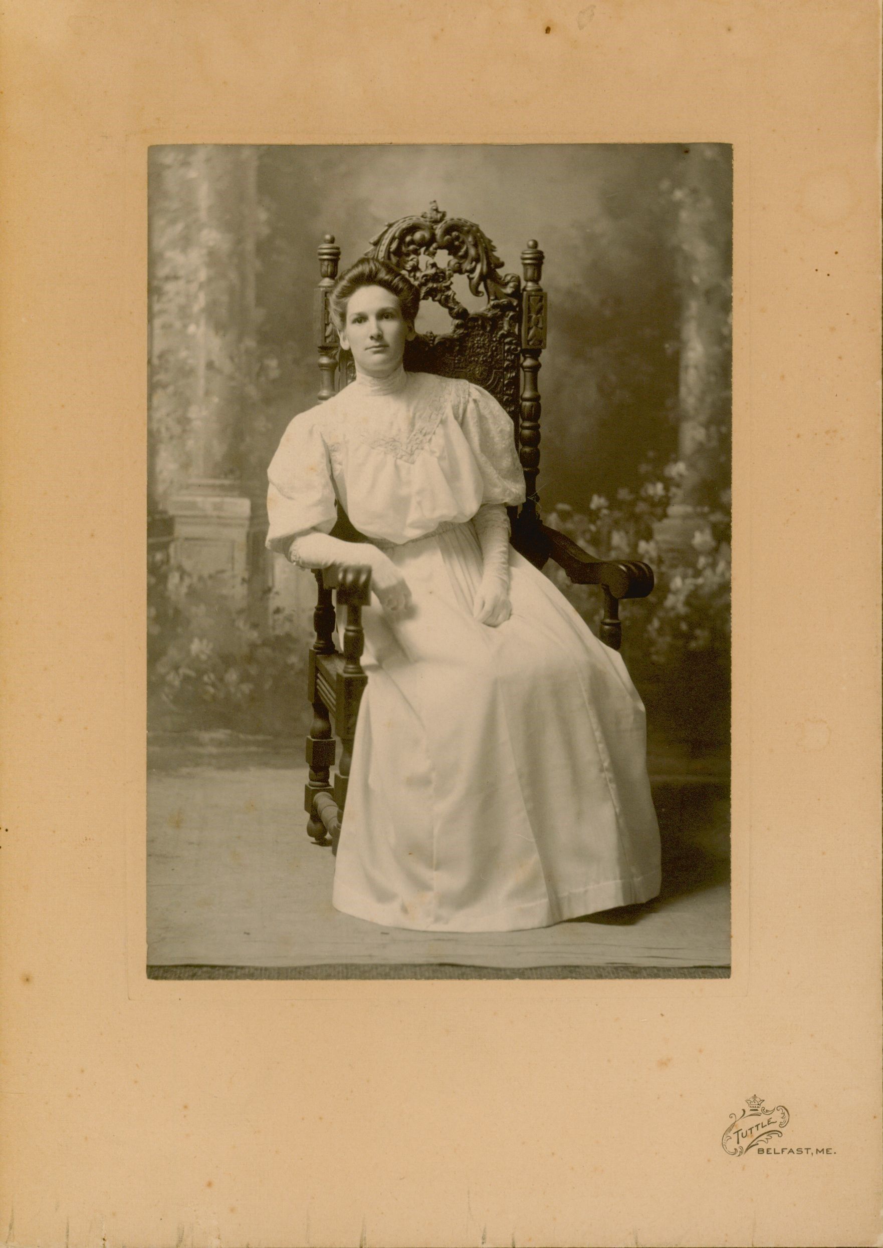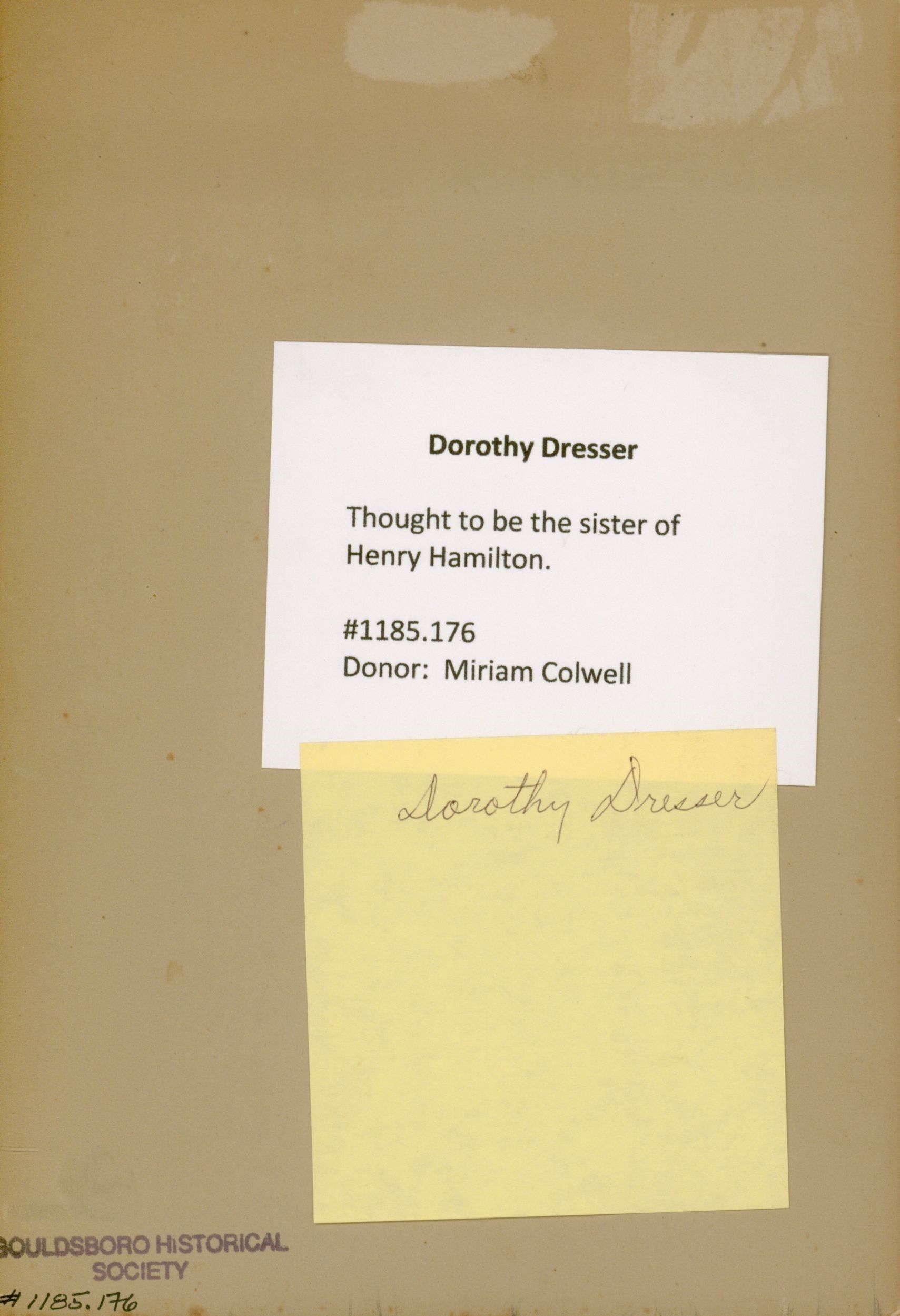 Dorothy Dresser sitting in a chair. Notes on the back suggest that she is the sister of Henry Hamilton (which could not be verified).Photograph Details