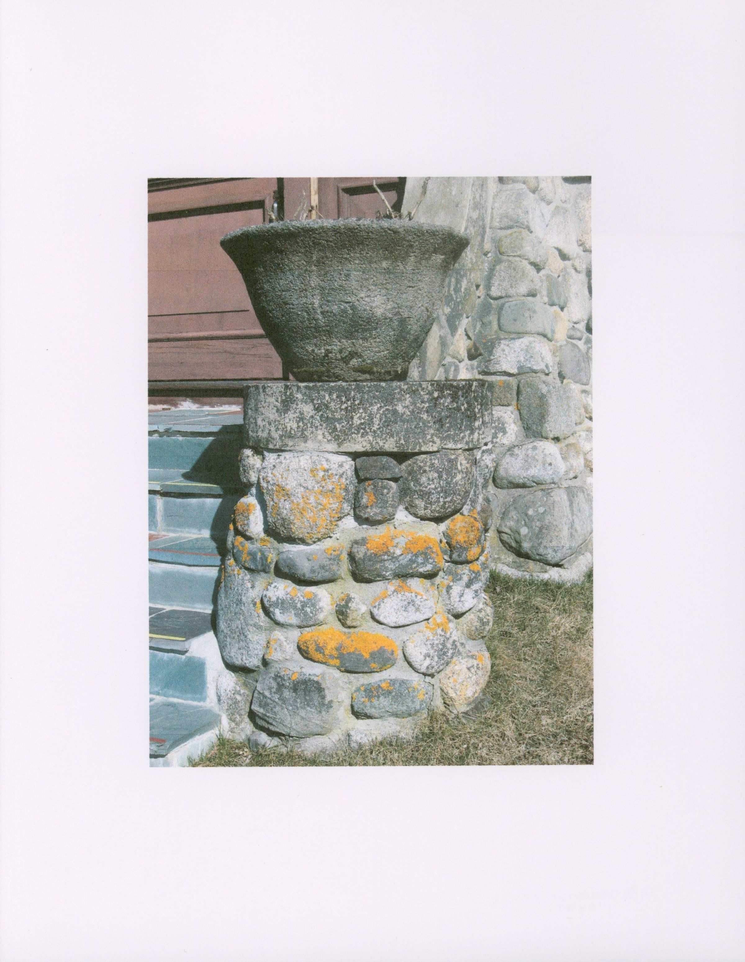 Soderholtz flower pot on stairs of West Gouldsboro Village Library (wide view).Entry/Object ID