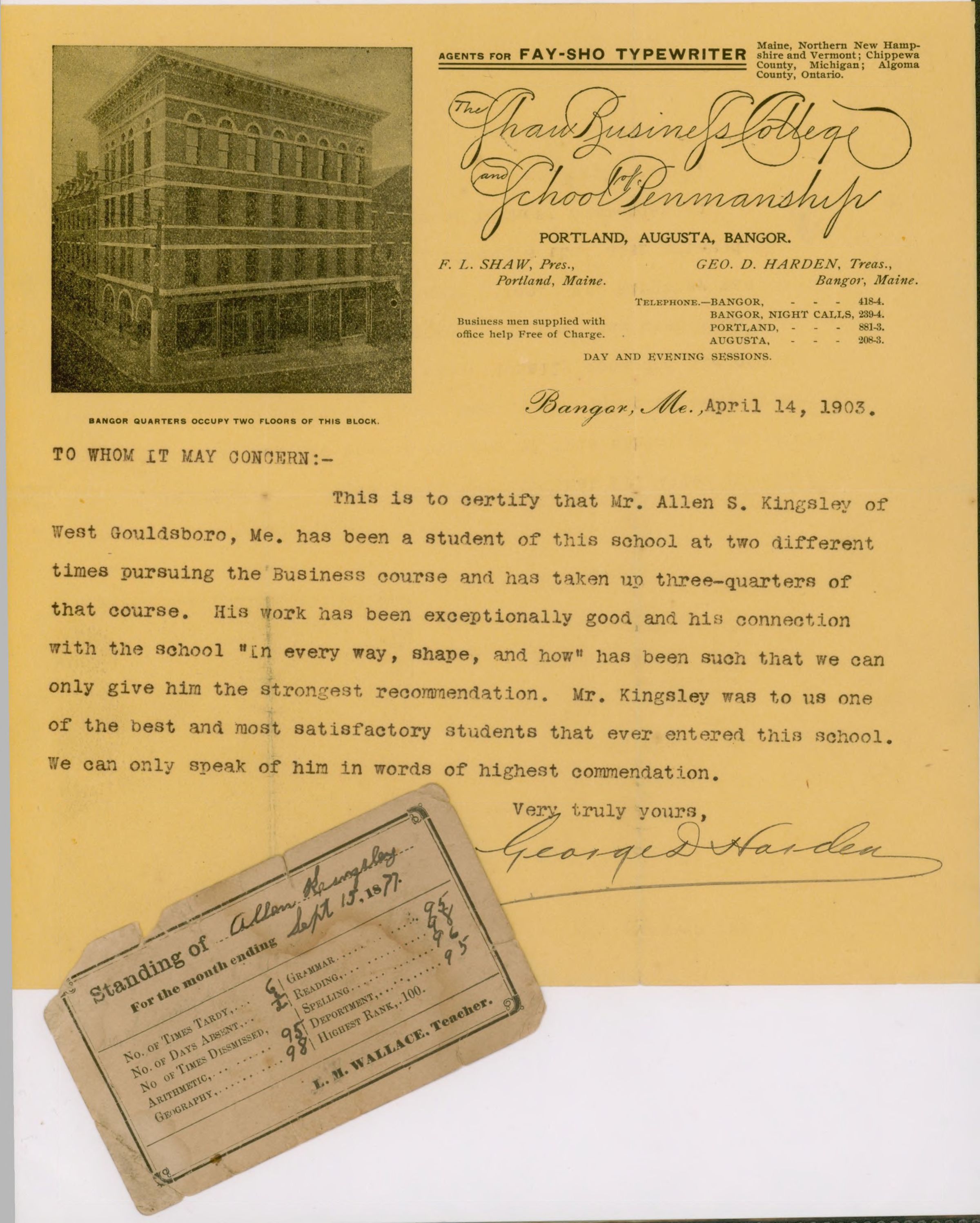 Letter of Reference for Allen S. Kingsley from the Shaw Business College and School of Penmanship.Archive Items Details