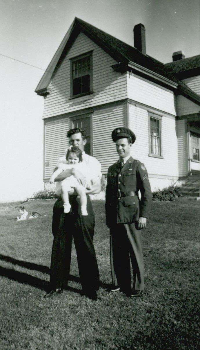 Allison Walker Workman with his daughter Ann Marie, and brother, Gordon Russell Workman, in front of the Keeper's Cottage at the Prospect Harbor Lighthouse. Pal is relaxing in the grass. Ann Marie Workman later married Larry E. Smith, Sr. of Winter Harbor.Photograph Details