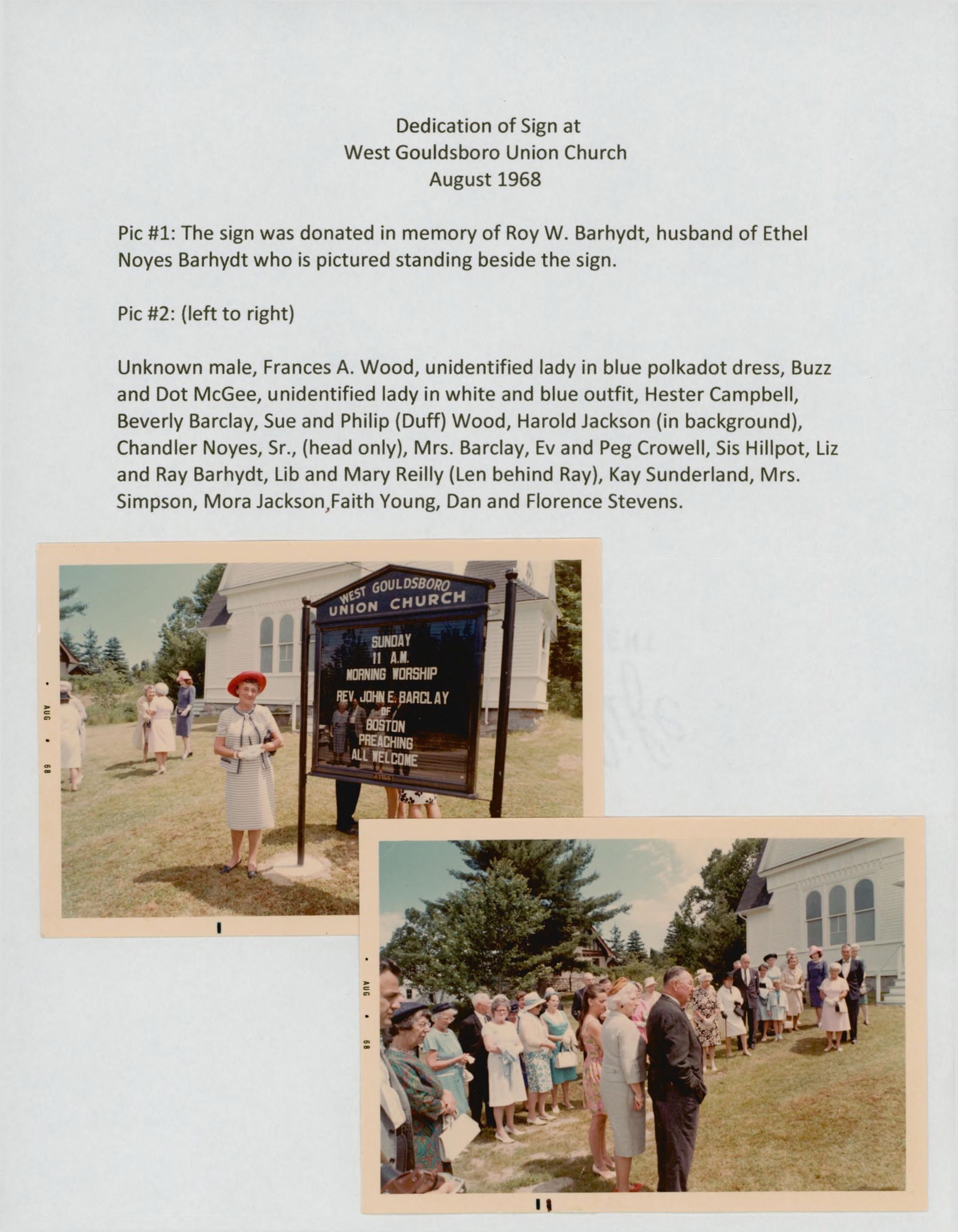 Two photos of the sign dedication at the West Gouldsboro Union Church. The sign was dedicated to Roy W. Barhydt, husband of Ethel Noyes Barhydt. Two photos of ceremony included.Archive Details