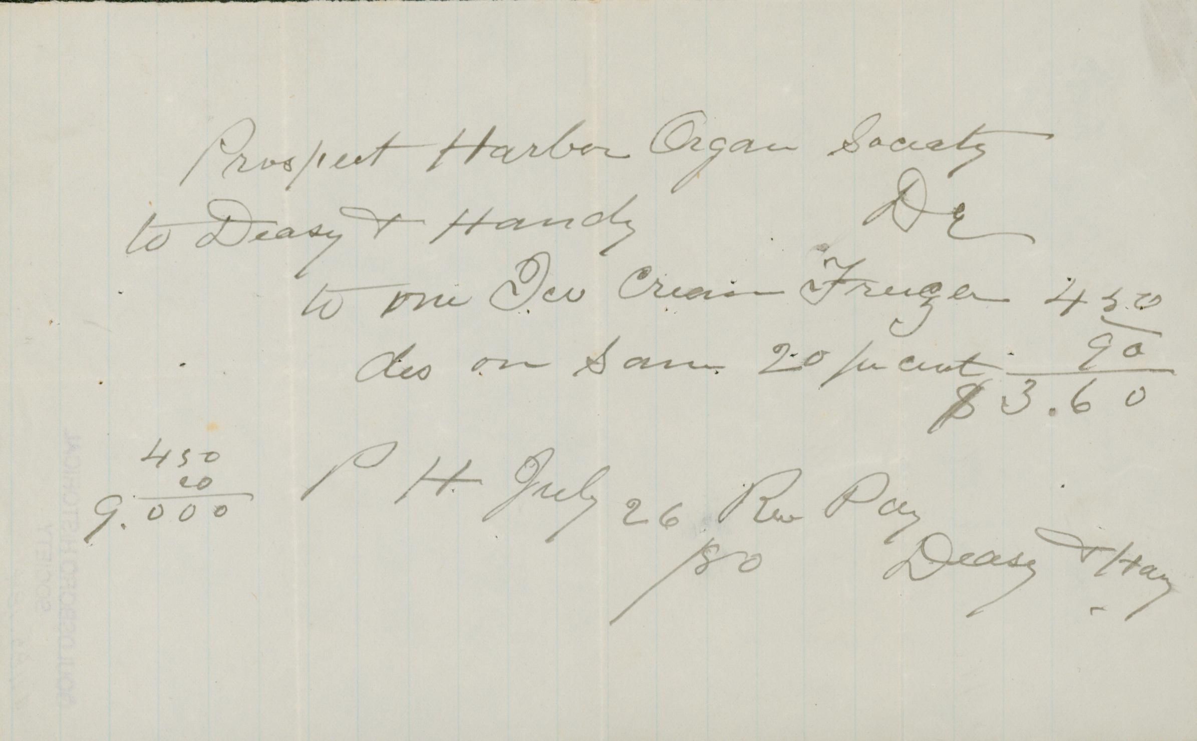 Receipt. Prospect Harbor Organ Society. Deasy and Handy.Lexicon