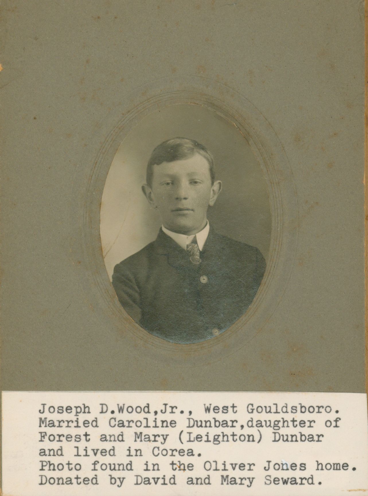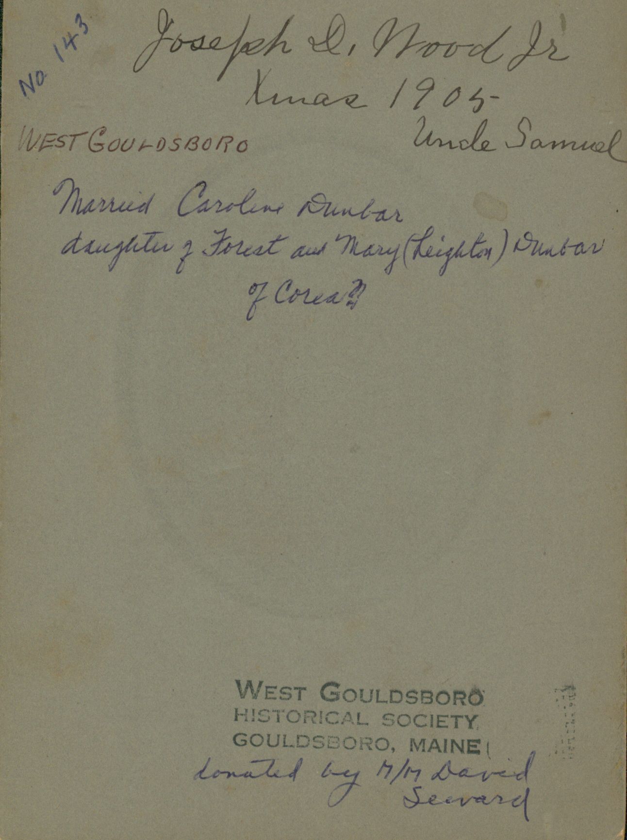 Joseph Dunnell Wood, Jr. Married Caroline Dunbar, daughter of Forest and Mary Leighton Dunbar. They lived in Corea, Maine. Photo found in the Oliver Jones house.Photograph Details