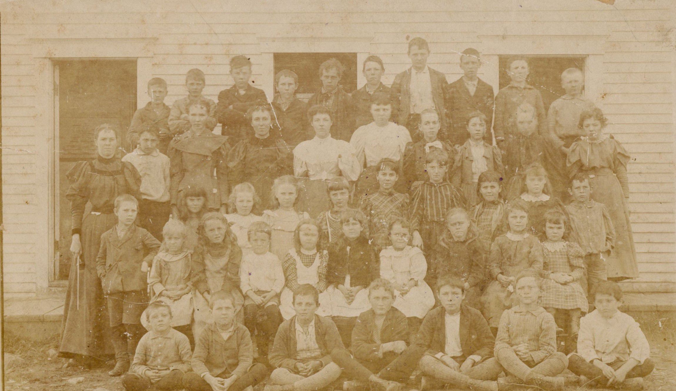 Undated photo of 45 Birch Harbor Grammar School students and their teacher in front of the white one-room school house.Photograph Details
