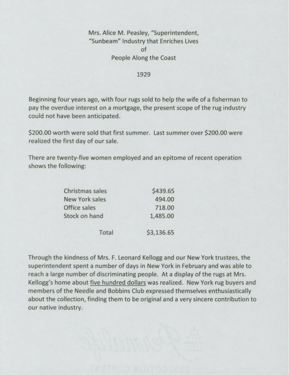 Annual Report from Alice M. Peasly regarding revenue generated from rug making. Maine Seacoast Mission. 1929.Publication Details