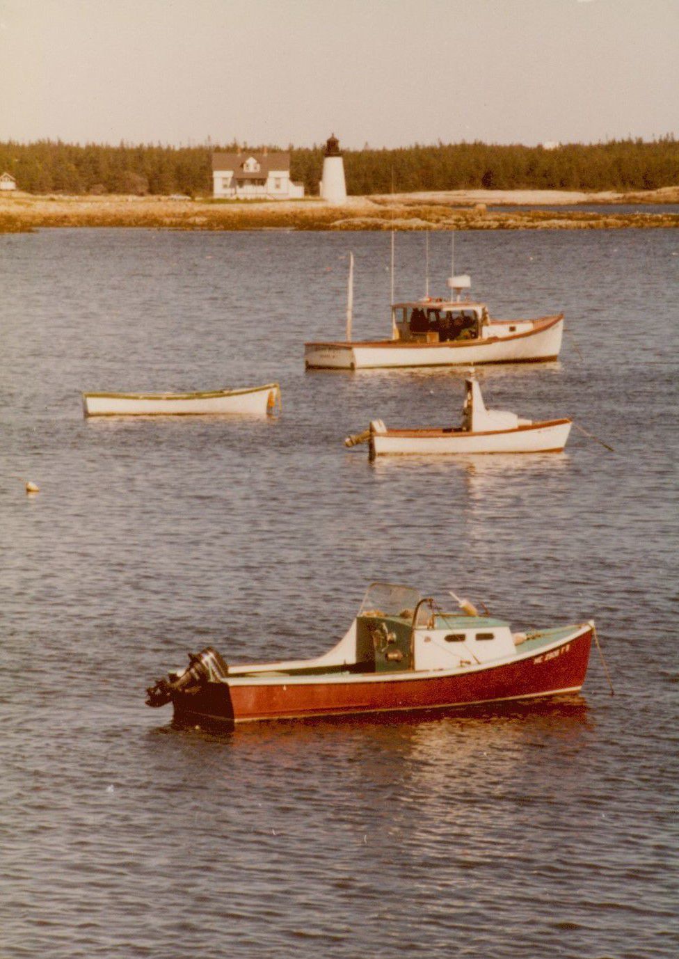 Prospect Harbor Lighthouse and Keeper's Cottage with lobster boats in the foreground.Entry/Object ID