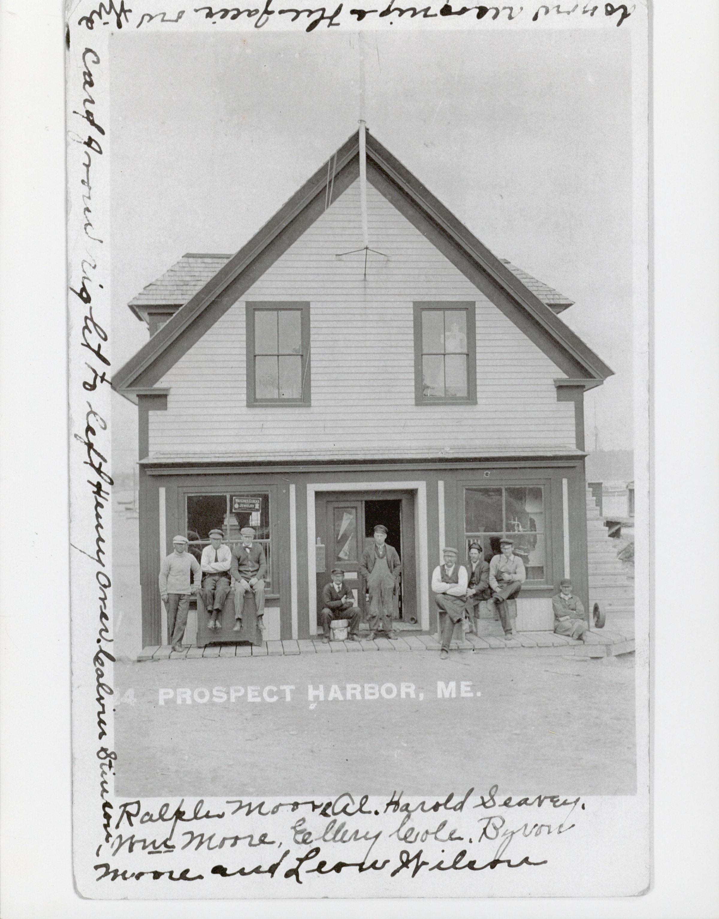 Byron Moore's Store in Prospect Harbor, ME. Right to left: Henry Over, Calvin Stinson, Ralph Moore, Al, Harold Seavey, William Moore, Ellery Cole, Byron Moore, and Leon Wilson.Subject Person/Organization