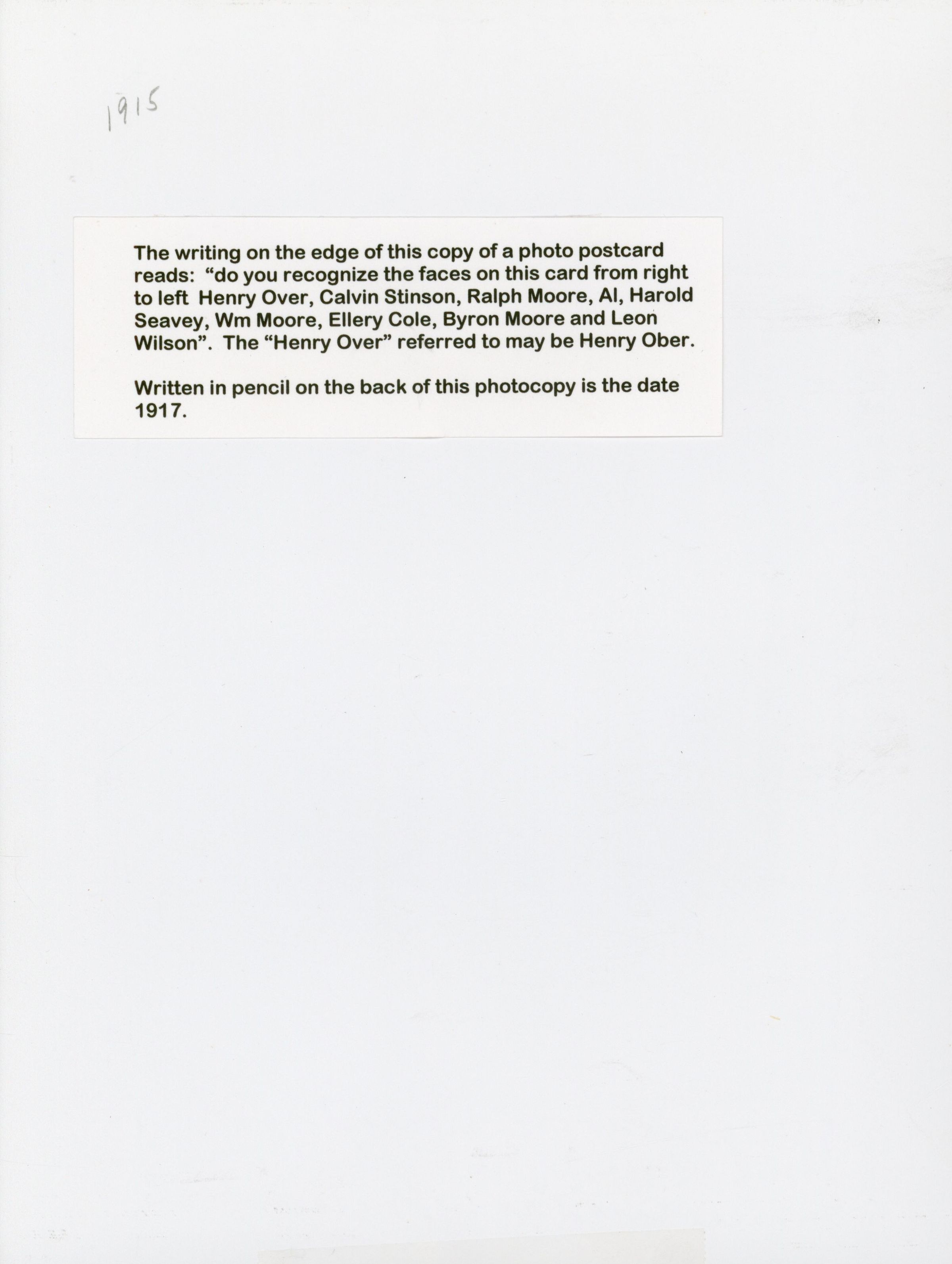 Cole, Ellery (1879 - 1961), Over, Henry Taft (1878 - 1928), Stinson, Calvin La Forrest, Sr. (1891 - 1992)., Moore, Ralph William (1879 - 1941), Seavey, Harold., Moore, William H. (1850 -1934, Moore, Byron Murray (1881 - 1960)., Wilson, Leon (1889 - 1994)Subject Place