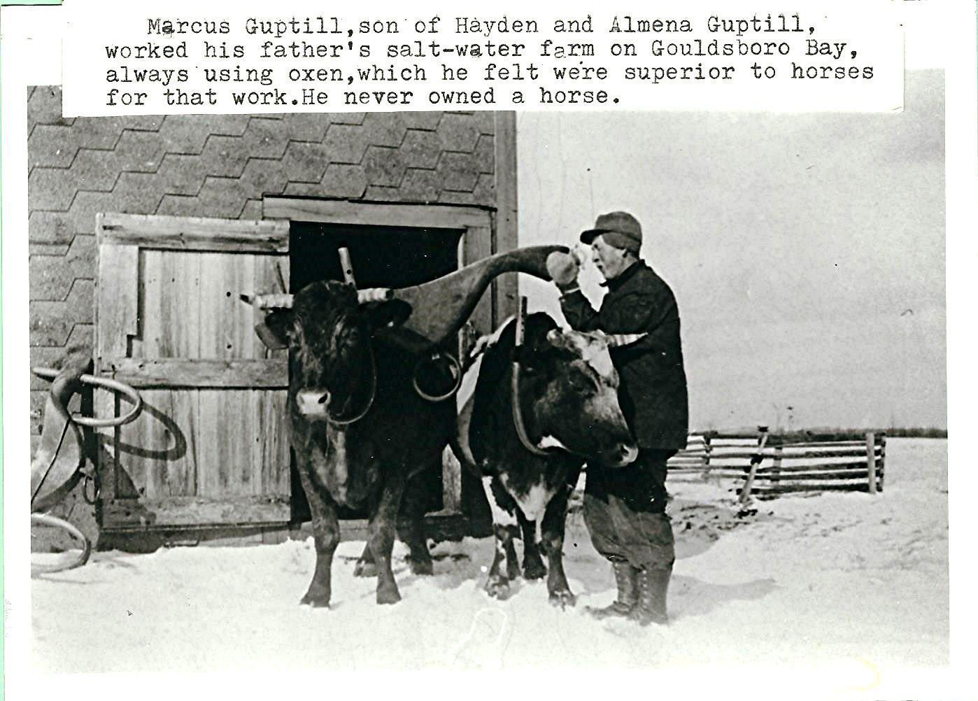 Marcus Guptill, son of Hayden and Almena Guptill, worked his father's salt-water farm on Gouldsboro Bay, always using oxen, which he thought were superior to horses for that work. He never owned a horse.Photograph Details