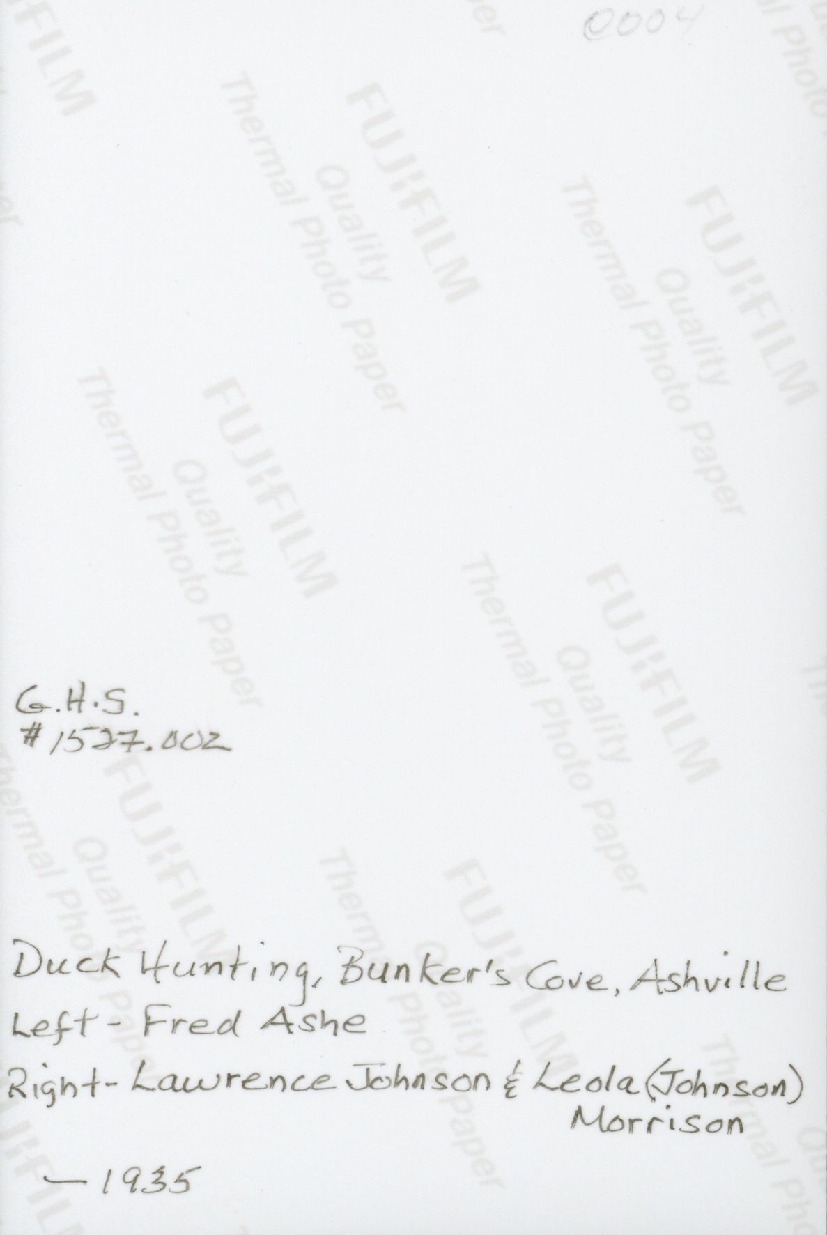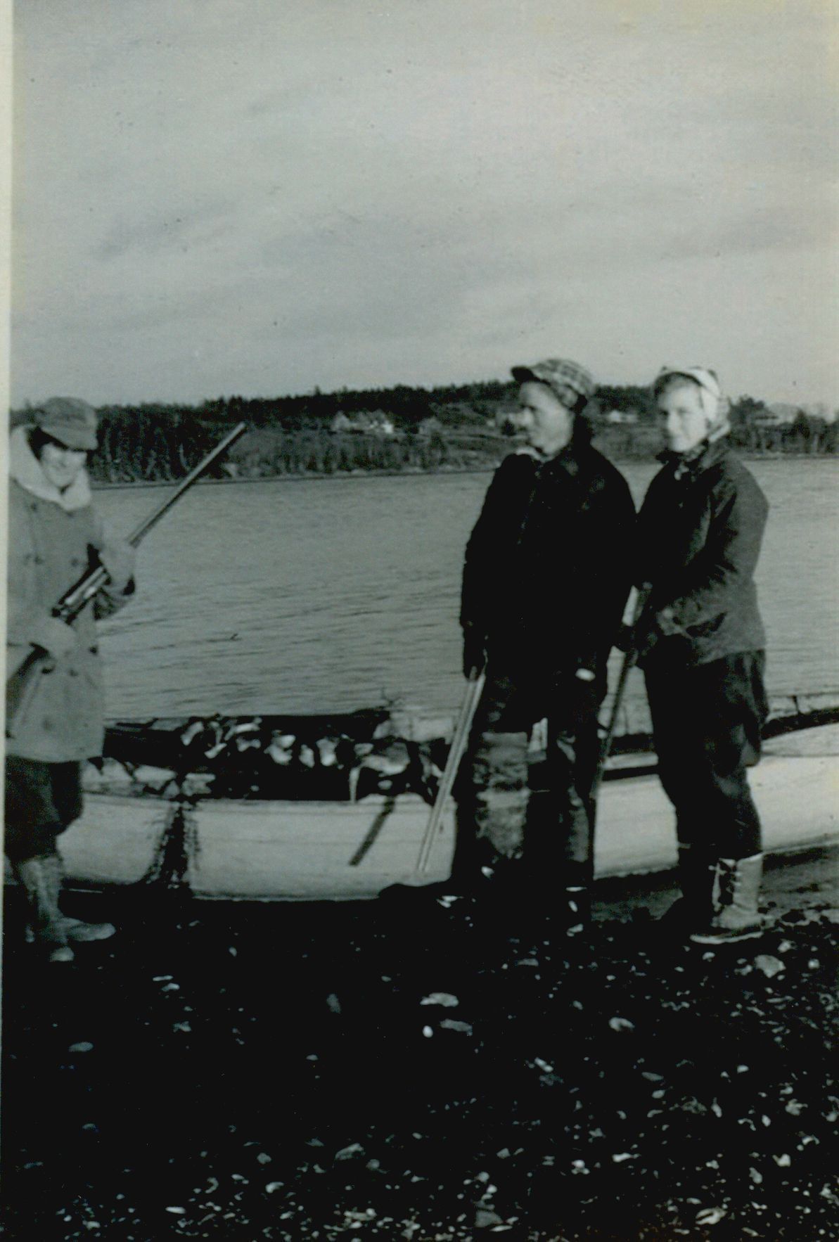 Duck hunting in Bunker's Cove. Three hunters standing on the shore. Left - Fred Ashe Right - Lawrence Johnson and Leola (Johnson) Morrison