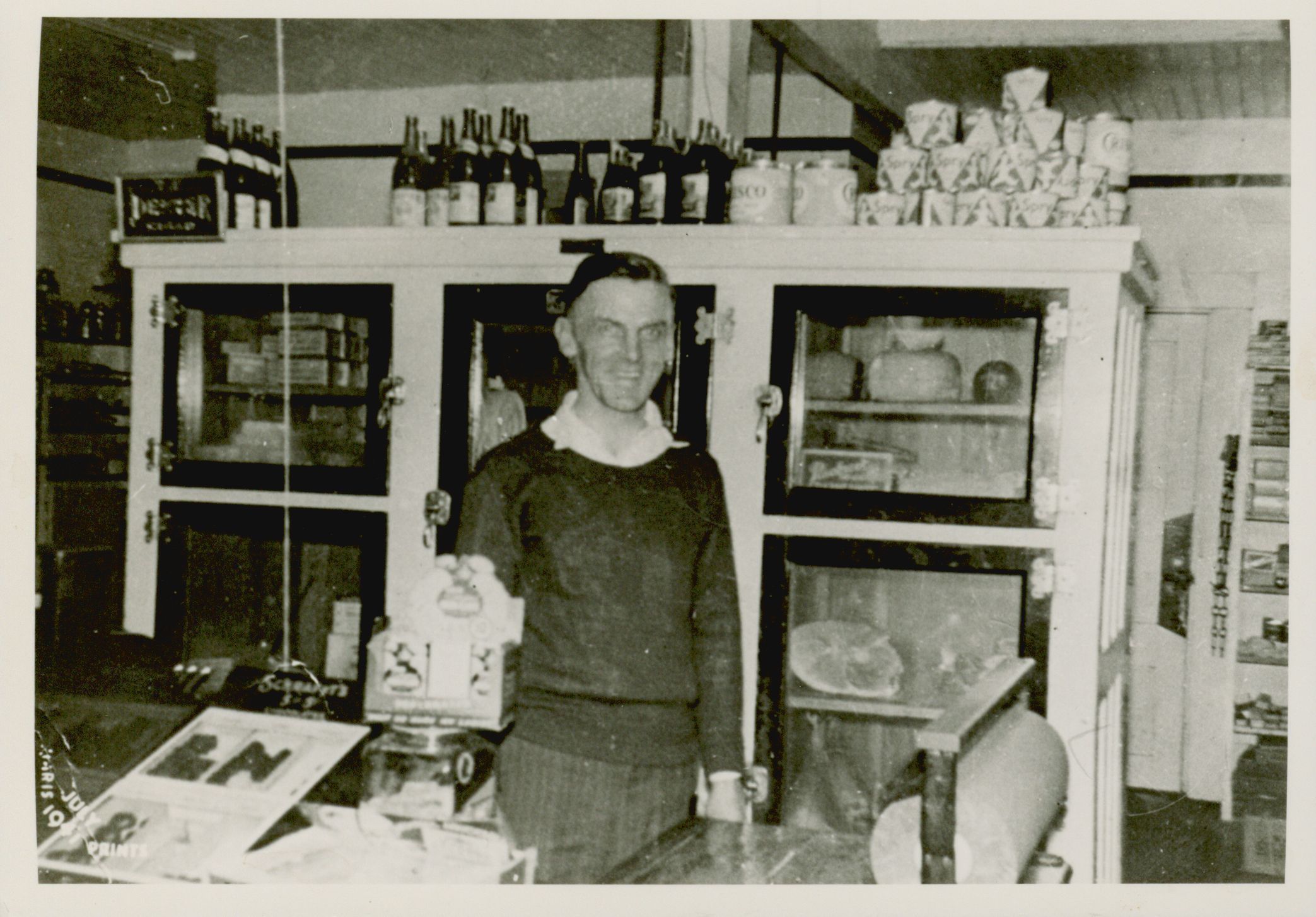 Inside view of Noyes Store in W. Gouldsboro. Chandler L. Noyes, Sr. is behind the counter.Photograph Details