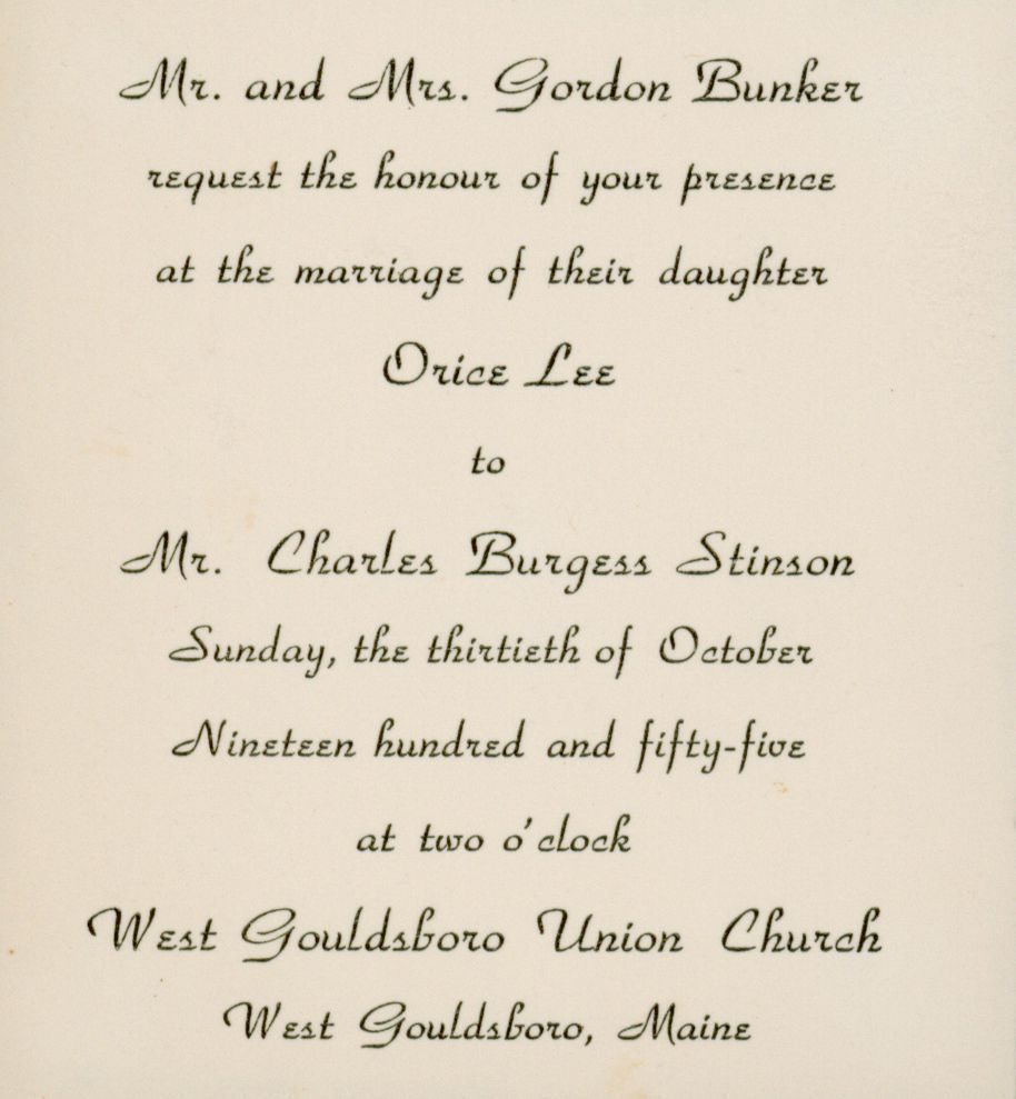 Wedding Invitation for Orice Lee Bunker and Charles Burgess Stinson at the West Gouldsboro Union Church on October 30, 1955.