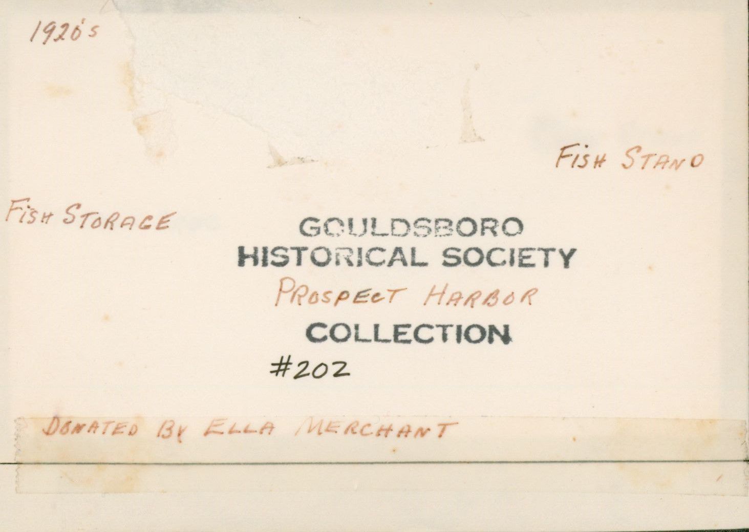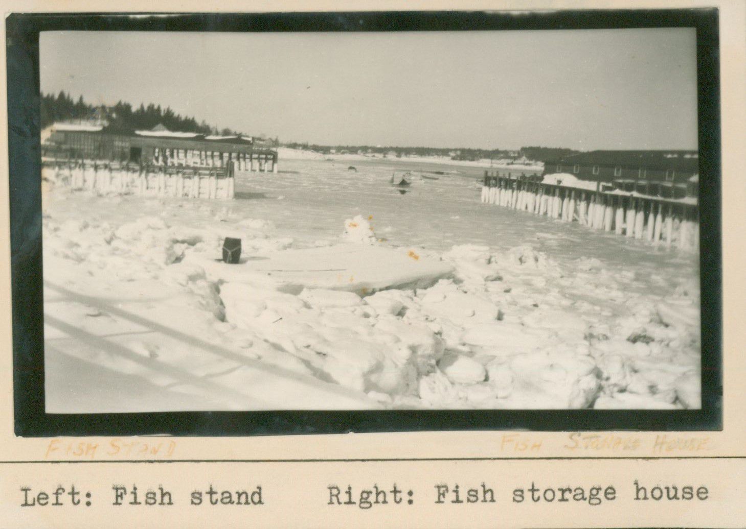 Winter view of the shore of Prospect Harbor. Blance's Store on the left. Moore's Store on the right.Photograph Details