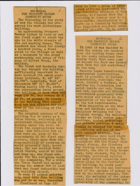 Prospect Harbor Union Church built in 1872. After congregation was disbanded circa 1948, it became the Community Club, then the home of the Prospect Harbor Women's Club. The steeple was restored in 1956 and later removed.Update Date