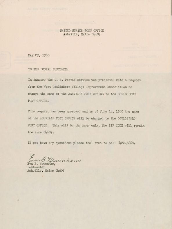 Notification of Ashville Post Office name change to Gouldsboro Post Office on May 29, 1980. Letter written by Eva B. Newenham, Postmaster.Subject Person/Organization