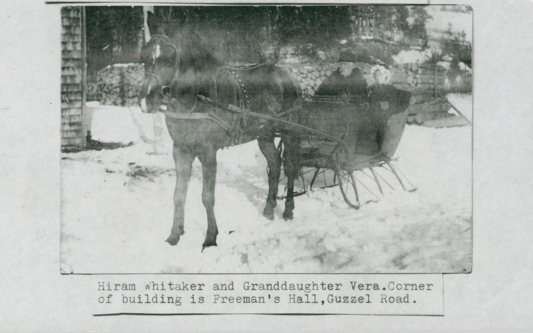 Hiram Whitaker and granddaughter Vera in a sleigh near Freeman's Hall on the Guzzel Road.Photograph Details