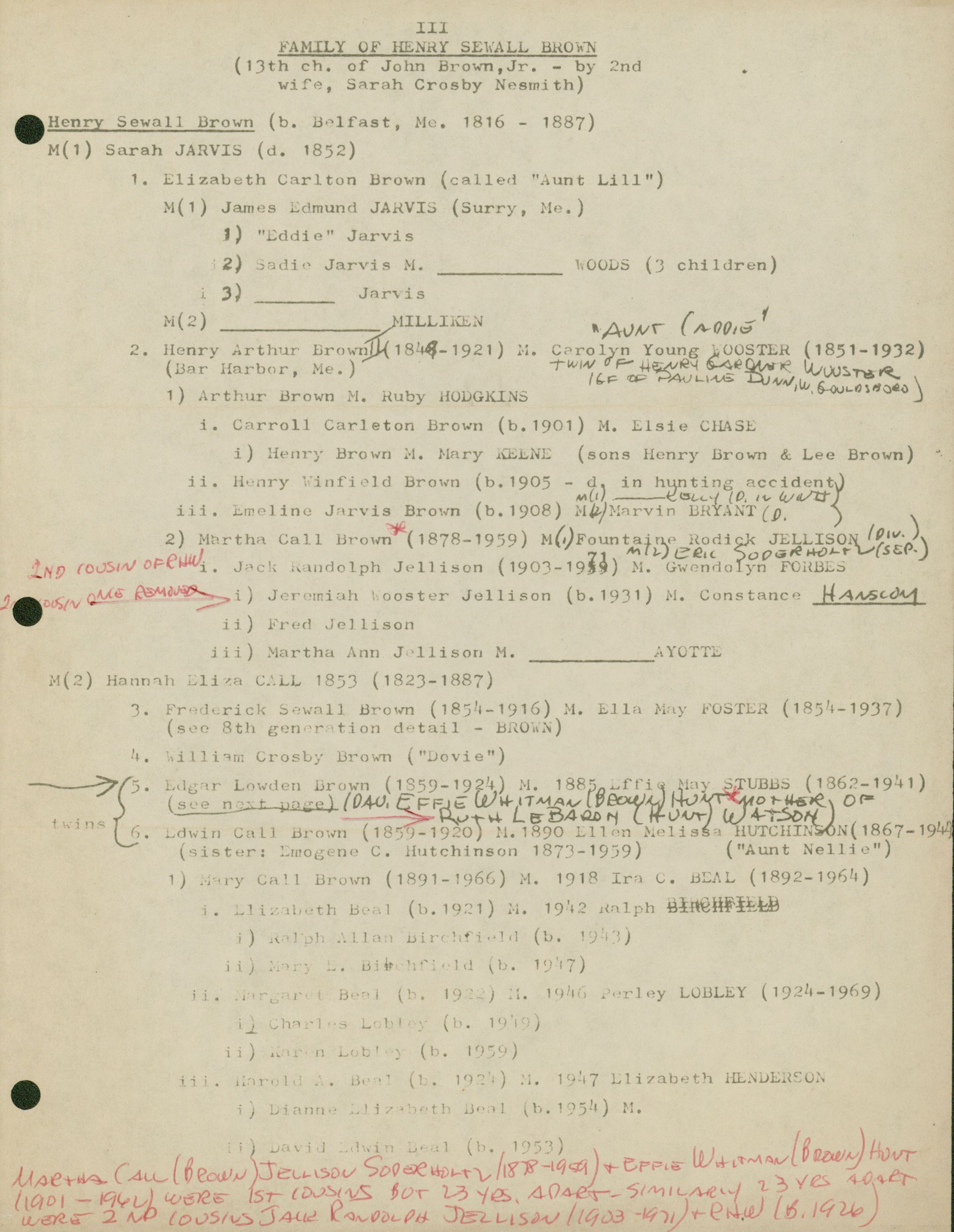 Family tree of Henry Sewall Brown, father of Martha Call Brown Jellison, second wife of Eric Ellis Soderholtz.Relationships