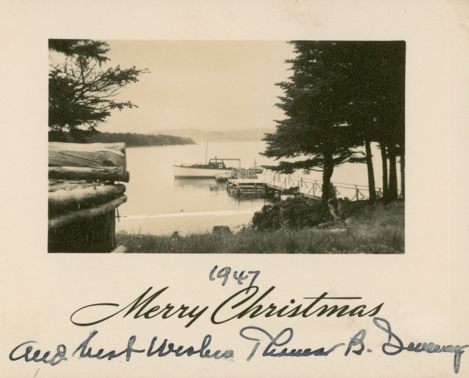 Christmas card with photo of the Lucia in Summer Harbor.Subject Place