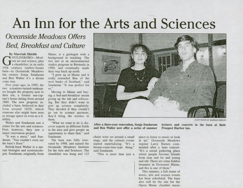 A clipping about the renovated Oceanside Meadows Inn and their program for the Arts and Sciences. New owners - Ben Walters and Sonja Sundaram. Likely published in the Ellsworth American. Circa 2000.Publication Details