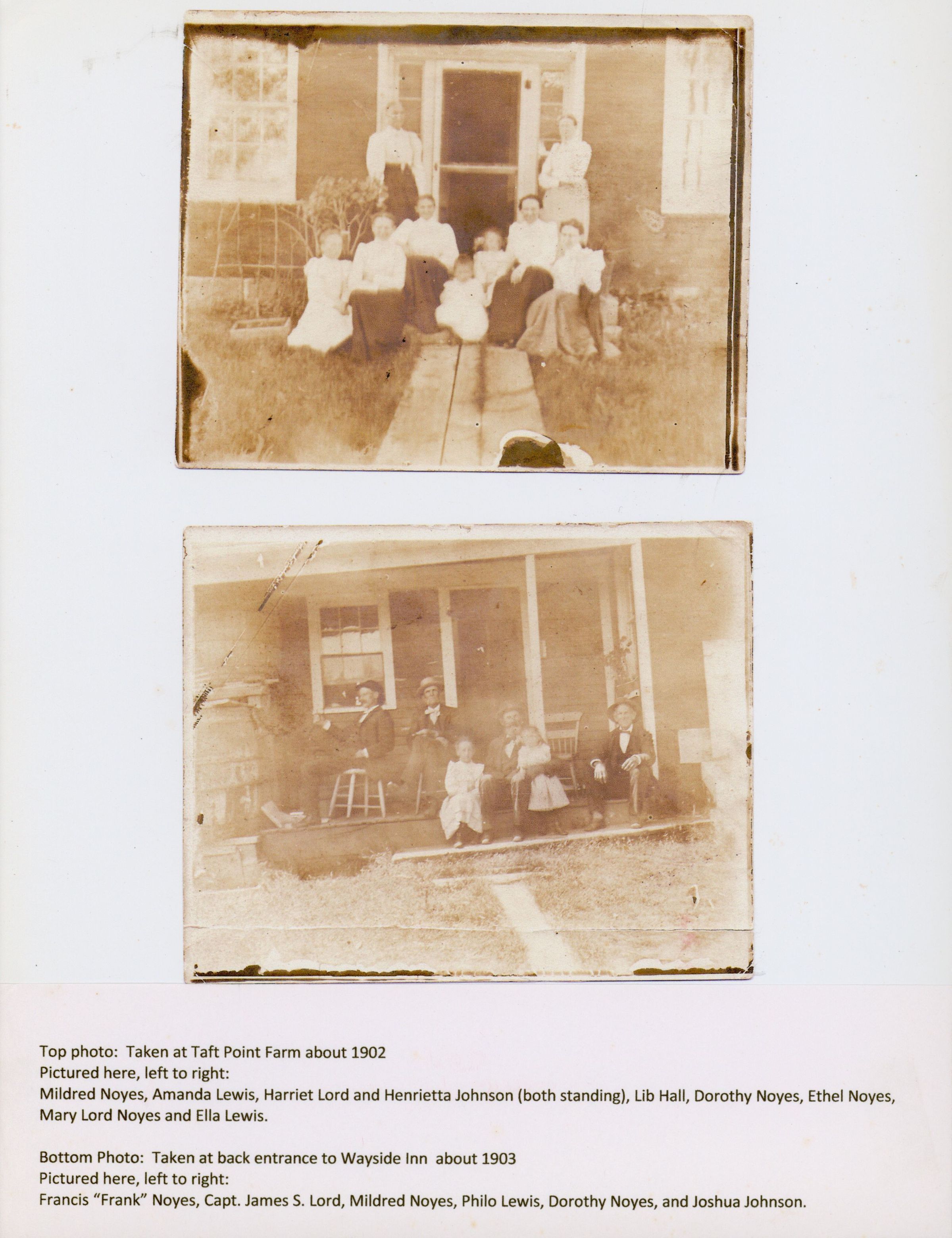 Two photographs of Noyes family members taken at Taft Point Farm and behind the Wayside Inn in 1902 and 1903. Names are listed below the photographs.Photograph Details