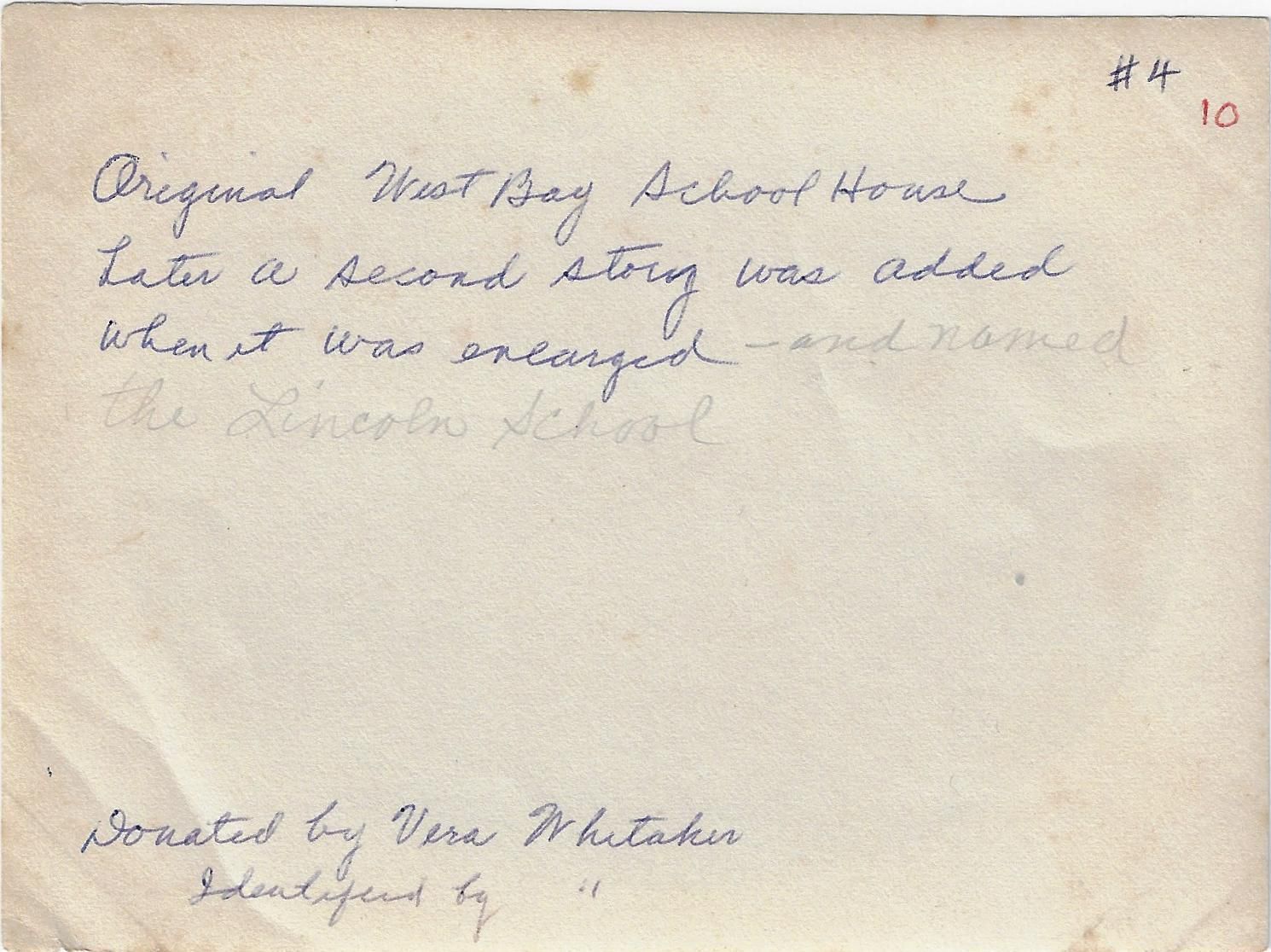 Original West Bay Schoolhouse. A second story was added later and it was renamed "the Lincoln School."Photograph Details